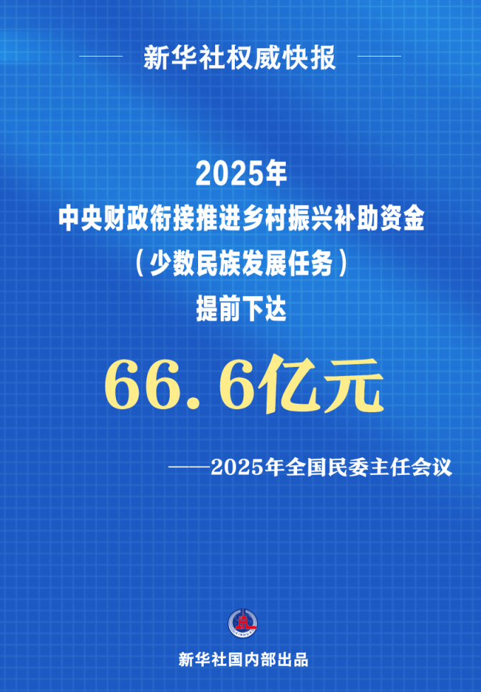 记者从1月15日召开的全国民委主任会议上获悉,2025年中央财政衔接推进乡村振兴补助资金(少数民族发展任务)66.6亿元已提前下达。