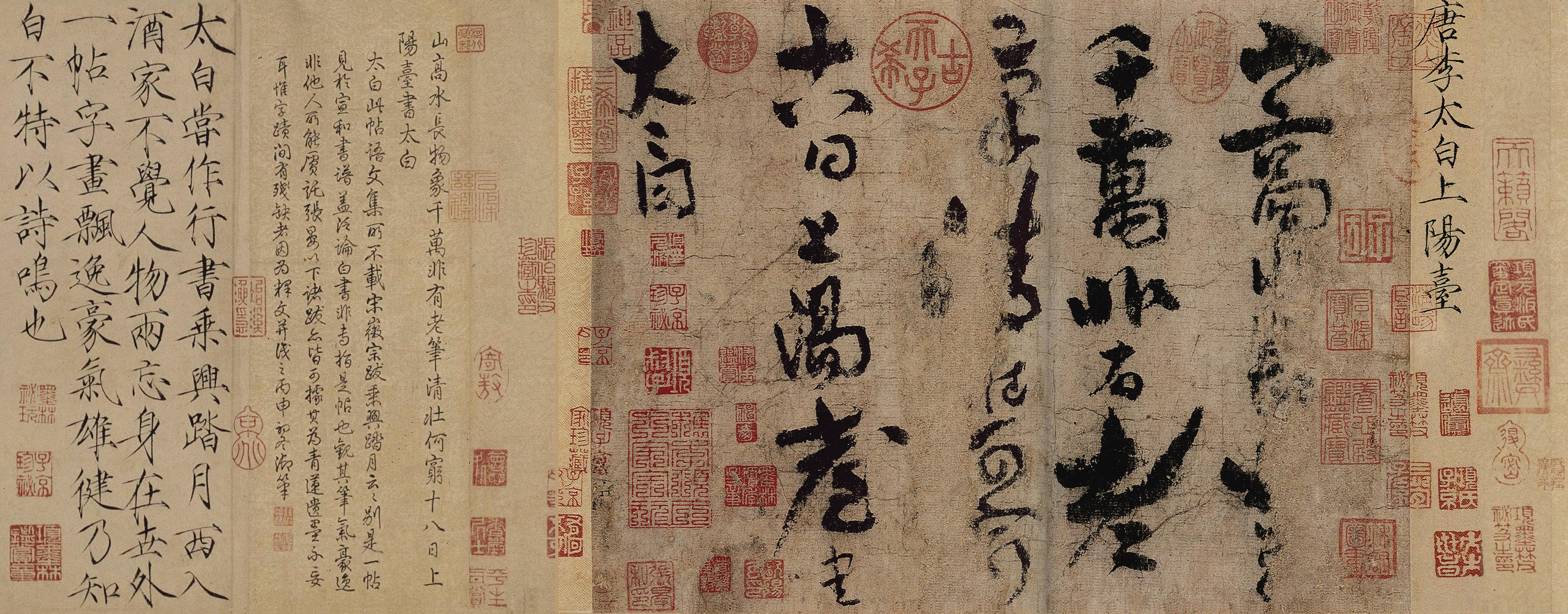 《上阳台帖》为李白自书四言诗,全文仅二十五字,此帖历经宋徽宗与诸多历代鉴藏家递藏。卷首有宋徽宗瘦金体亲题“唐李太白上阳台”,乾隆皇帝亦在引首亲笔写下“青莲逸翰”四字,足见对其珍爱有加。《上阳台帖》卷后,还附有宋徽宗、元张晏、欧阳玄、王馀庆、危素、驺鲁以及乾隆皇帝等人的跋文,自北宋以来流传有序,是现存唯一的李白法书墨宝,启功先生称此帖“字迹磊落”,梳理“它的流传经过,是历历可考的”,因此赞誉其为“肉迹”,称见其字犹如见到李白本人。