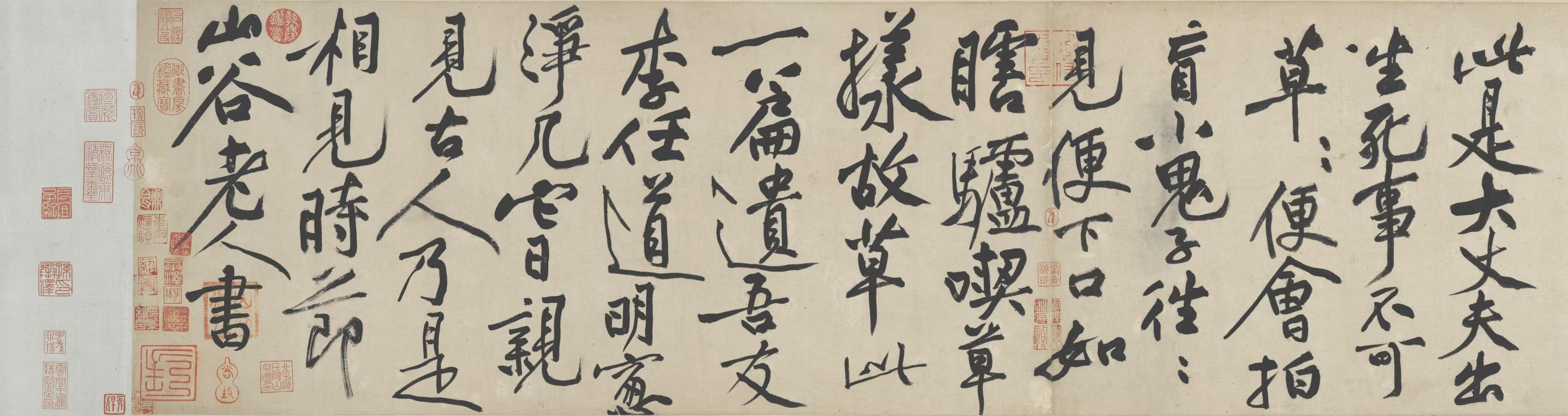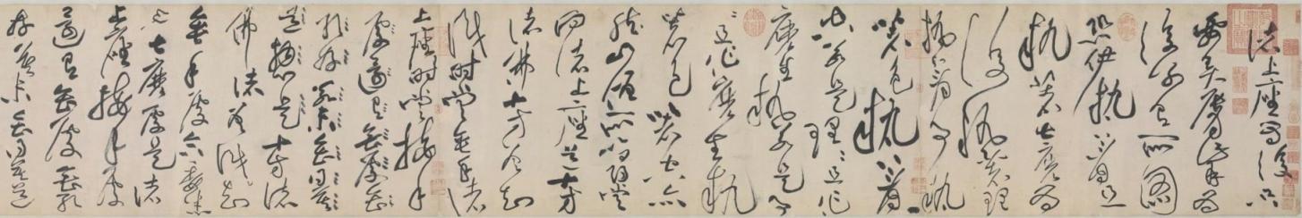 《诸上座帖》则是北宋大书法家黄庭坚的经典之作。黄庭坚身为“宋四家”之一以及“苏门四学士”成员,在中国书法史上占据着重要地位。这幅作品是他为友人李任道精心录写而成,内容源自五代金陵僧人法眼宗文益禅师的《语录》,不仅展现出其精湛的书法艺术,还承载着特定的文人交游与禅宗思想传播的意义。《诸上座帖》师法怀素狂草体,曾一度被命名为《摹怀素书》,该帖成书于黄庭坚晚年书艺最为成熟时期,笔意纵横,气势苍茫雄浑,字法奇宕高古,尽显黄庭坚悬腕摄锋运笔的高超书艺,被誉为黄庭坚传世法书的代表之作。《诸上座帖》传承有序,最初藏于南宋高宗内府,后归权相贾似道;明代辗转递藏于李应祯、华夏、周亮工处,清初为孙承泽所珍藏,乾隆时期收入内府。