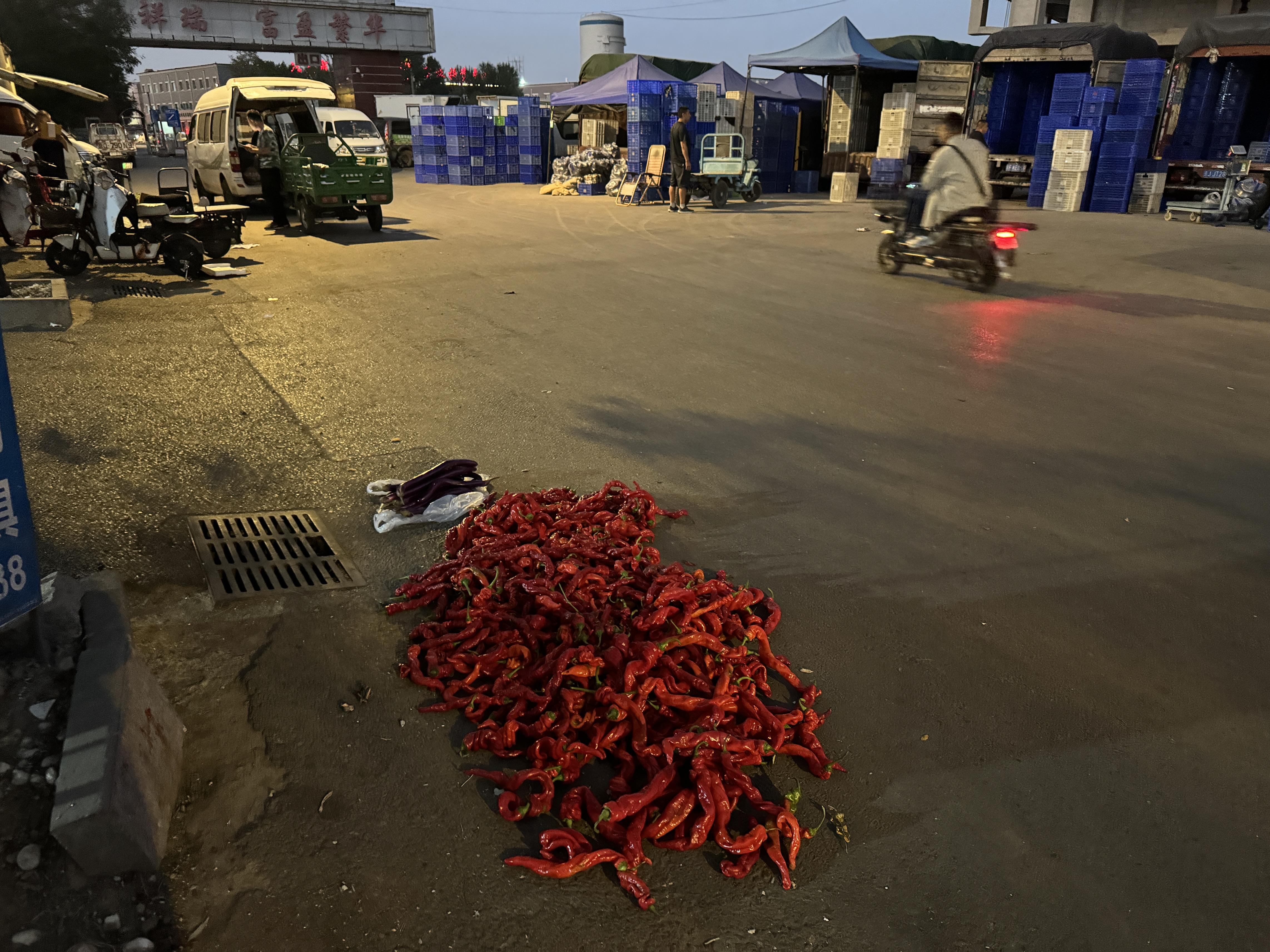 此时,不少手提袋子的人,正在翻捡被商户丢弃的蔬果。一名穿着精致的女孩格外引人注目,她手里提着一把芹菜、几个青椒,游走在一个个摊位旁,不时低头观察摊位周边的剩菜堆。走到一处辣椒摊位旁,她看到角落里被遗弃的红辣椒,便蹲下身翻捡,从一堆蔫了的辣椒中,翻捡出品相相对较好的辣椒,没多久就装满了一袋。她欣喜地拿出手机,拍摄起自己的“成果”:“看!今天捡到了这么多辣椒,回家做辣酱肯定很好吃!”