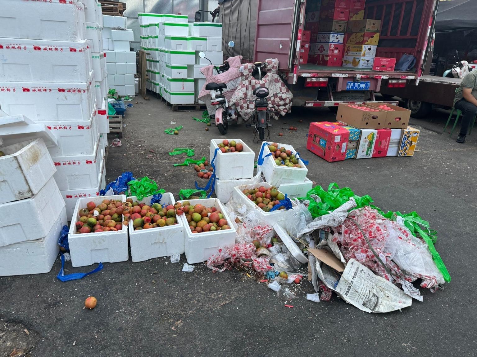 记者注意到,批发市场内人车混行,大货车、板车、三轮车往来频繁,鸣笛声不绝于耳。部分大型货车视野盲区大,不少人在装卸货的大车周边捡菜,甚至探身到车轮底下捡散落的菜叶,全然不顾自身危险。