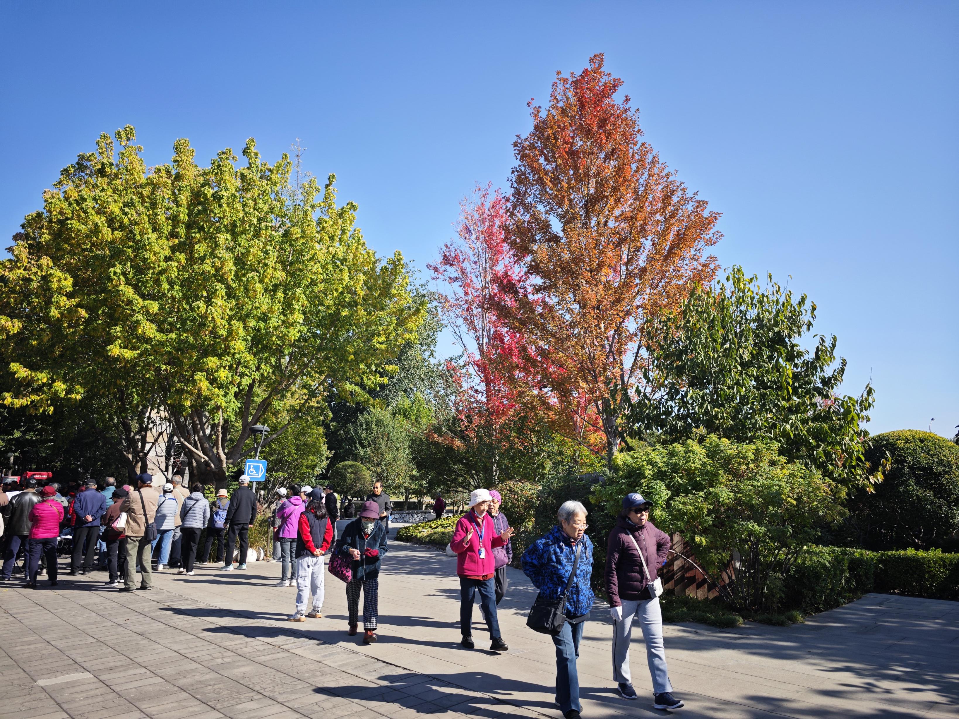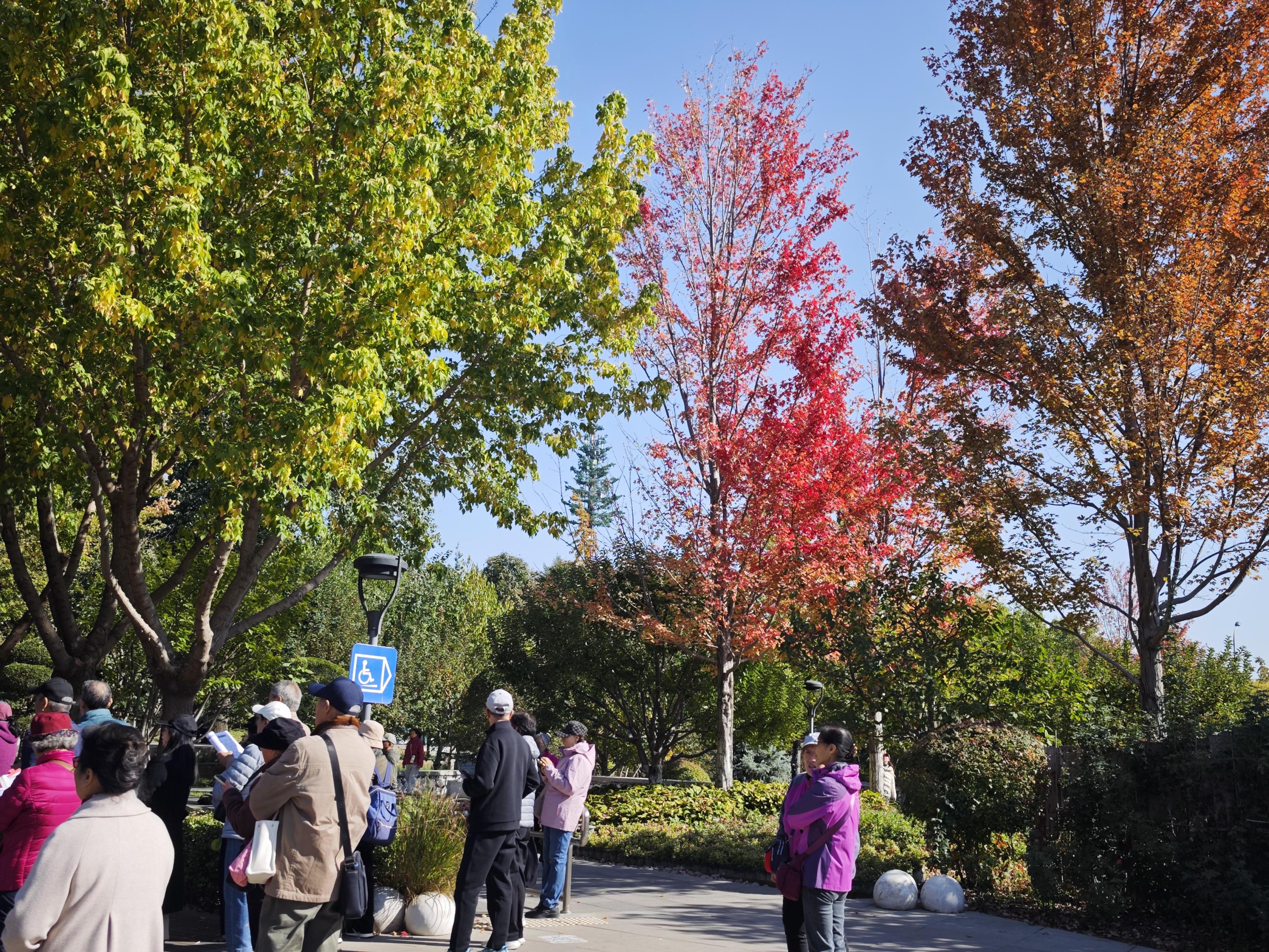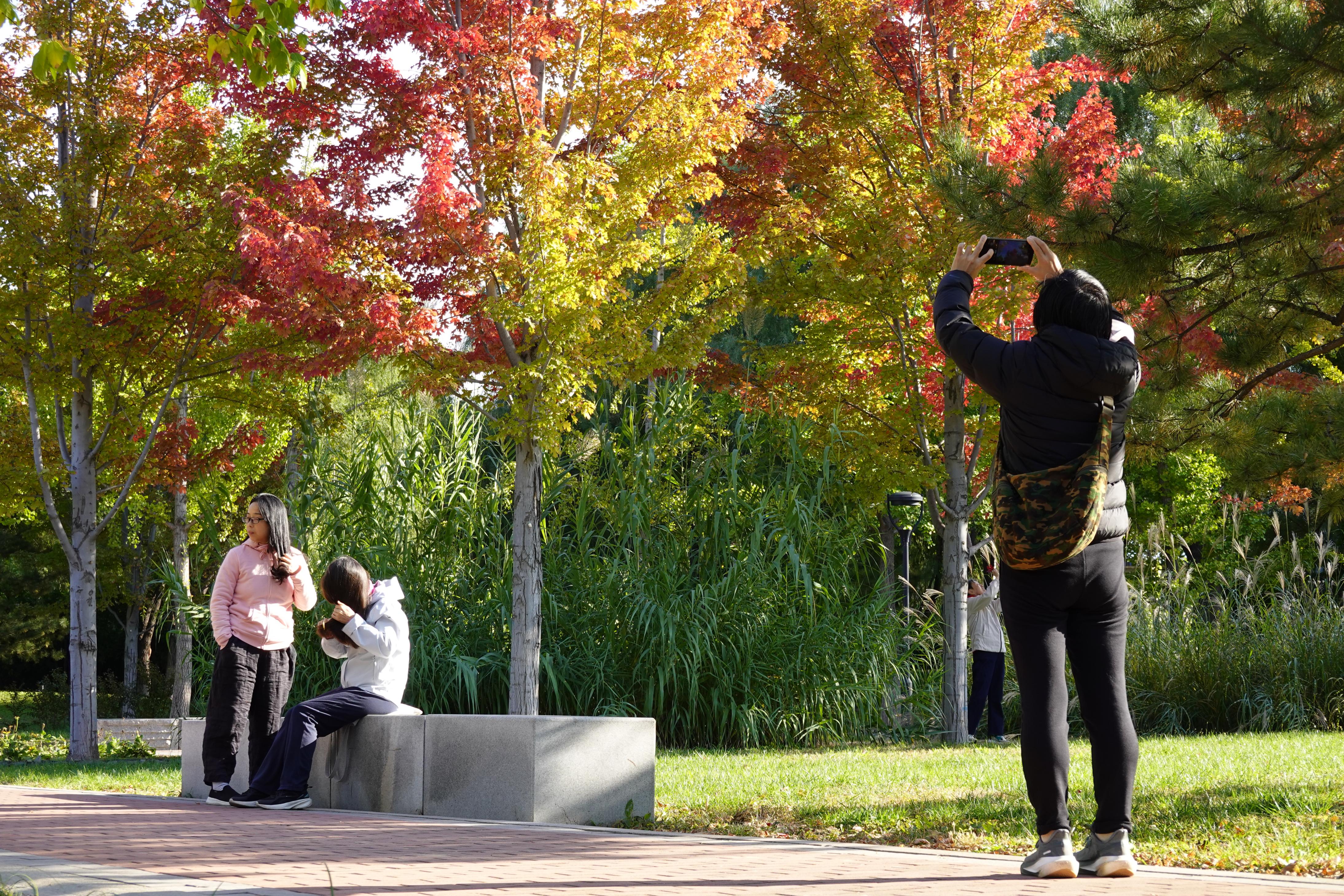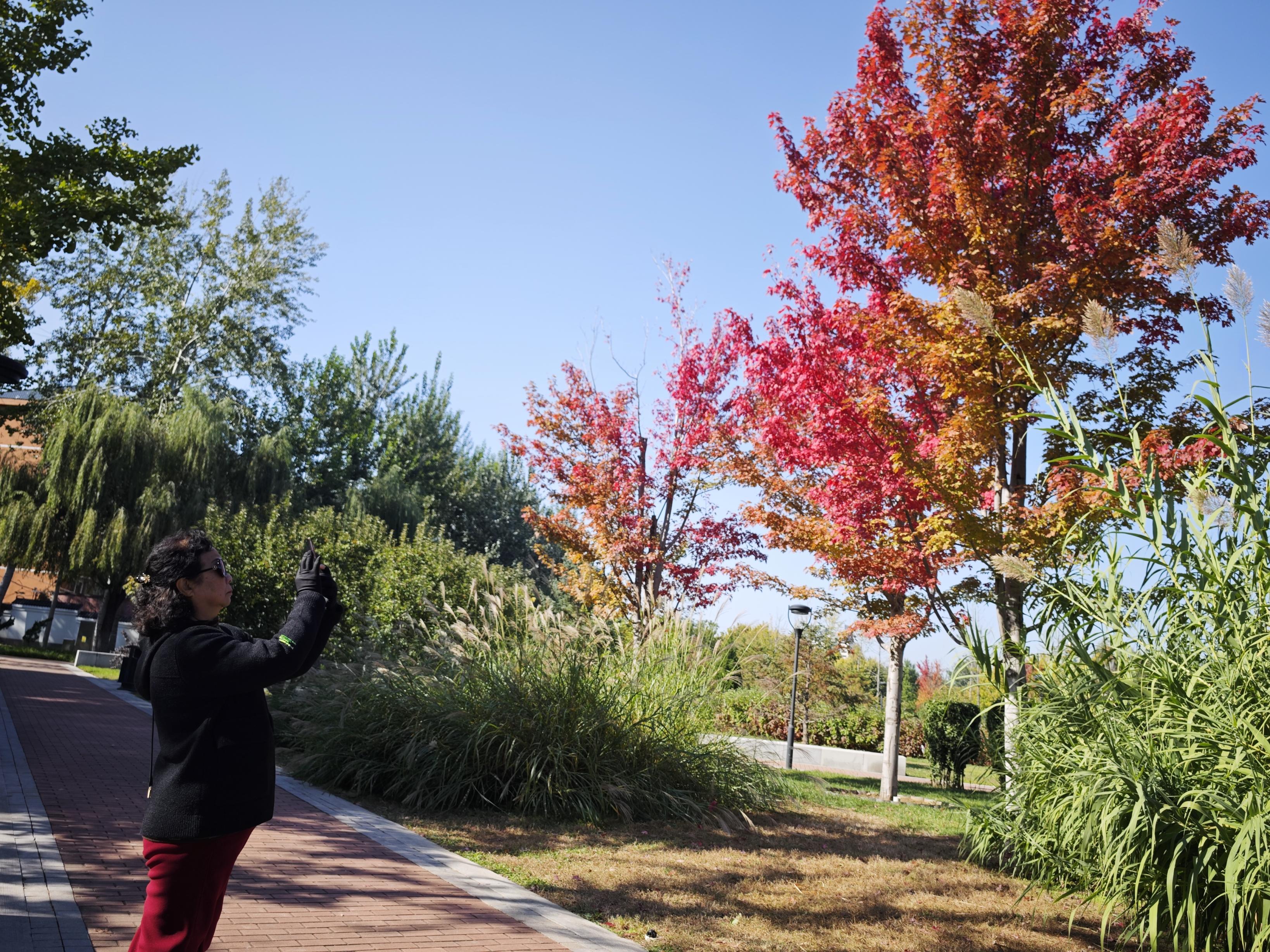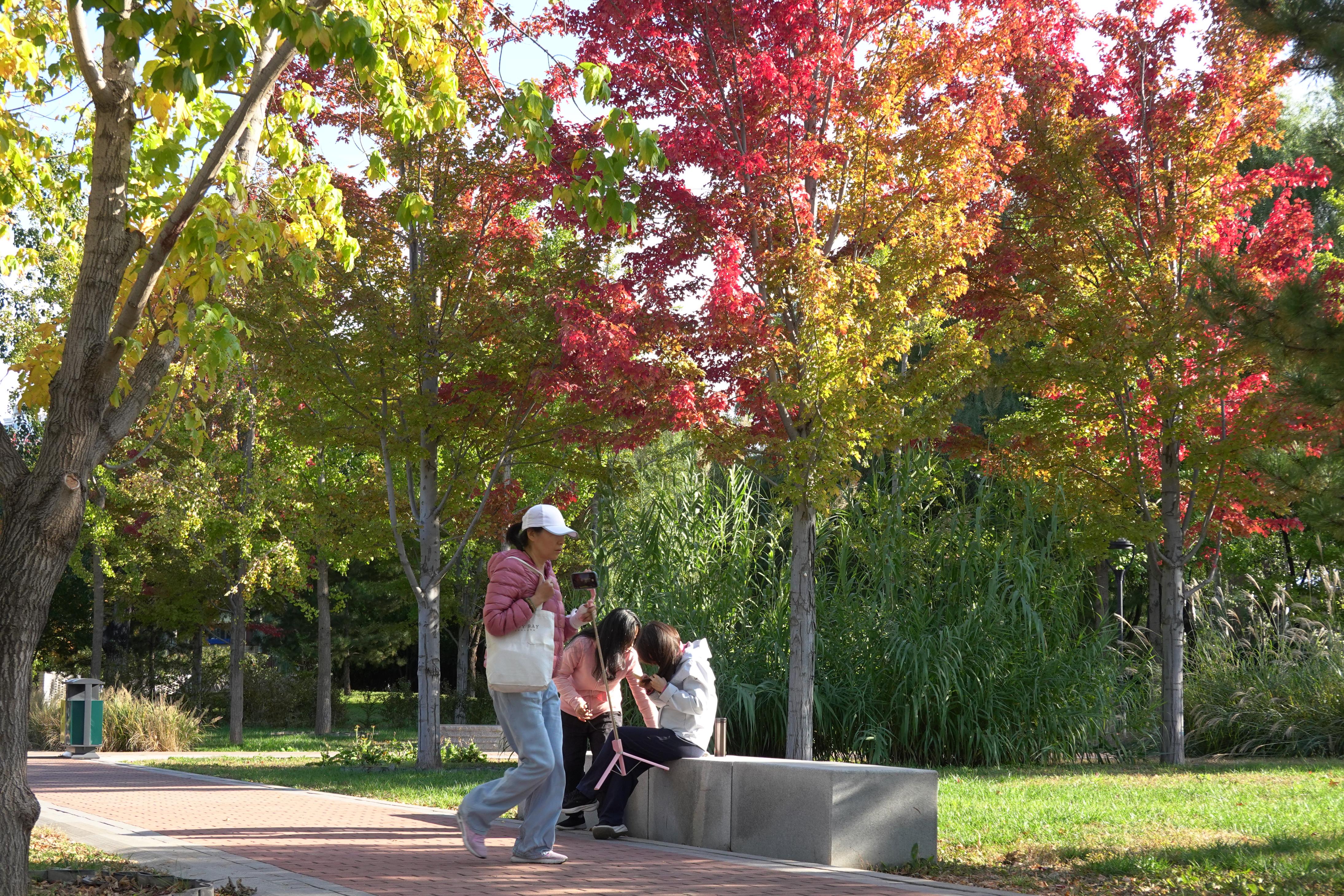 10月21日,市民来到北京国际雕塑公园欣赏园内彩叶。随着温度的降低,园内枫叶悄然变红,红枫似火、层层叠叠,与形态各异的雕塑交相辉映,构成一幅流动的艺术画卷。漫步林间,枫叶沙沙作响,仿佛在低语,引得游人驻足流连。