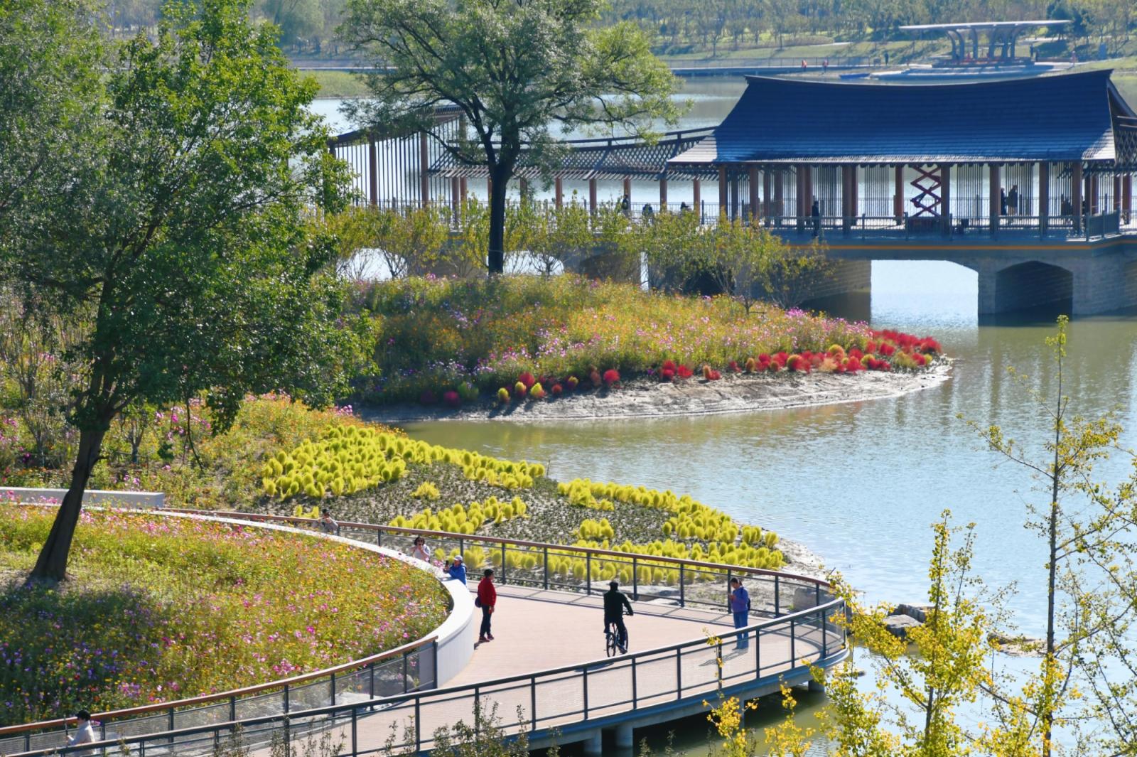 玉河湿地公园北接碧波荡漾的南沙河,沿玉河南路两侧分为南北两区,功能互补。北区紧邻故宫博物院北院区,深度融合皇家园林造园精髓与历史文化底蕴,“云台远眺”“闲亭枕水”“湖心廊桥”等特色景观节点让人流连忘返;南区不仅有儿童活动区、亲水戏水区、健身步道等基础休闲设施,还设置了雨水科普花园与市民休闲区,让休闲体验更丰富、更具功能性。