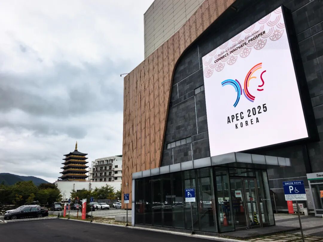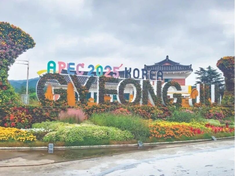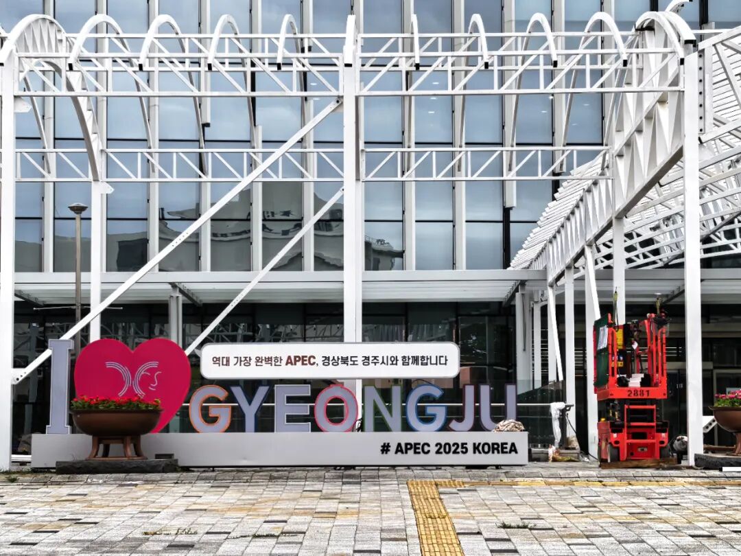 车辆初入庆州,眼前并不是想象中大城市的模样。道路两旁不仅没有高楼大厦,连建筑都很少,更多是绿意稻香,看上去很像是济州岛的风貌。车辆每到一个大路口,几乎都会看到“APEC 2025 KOREA GYEONGJU(APEC 2025 韩国 庆州)”的标志或花坛,还有“Welcome to Gyeongju(欢迎来到庆州)”的标语,似乎在告诉外面的来客,这里将有大事发生。