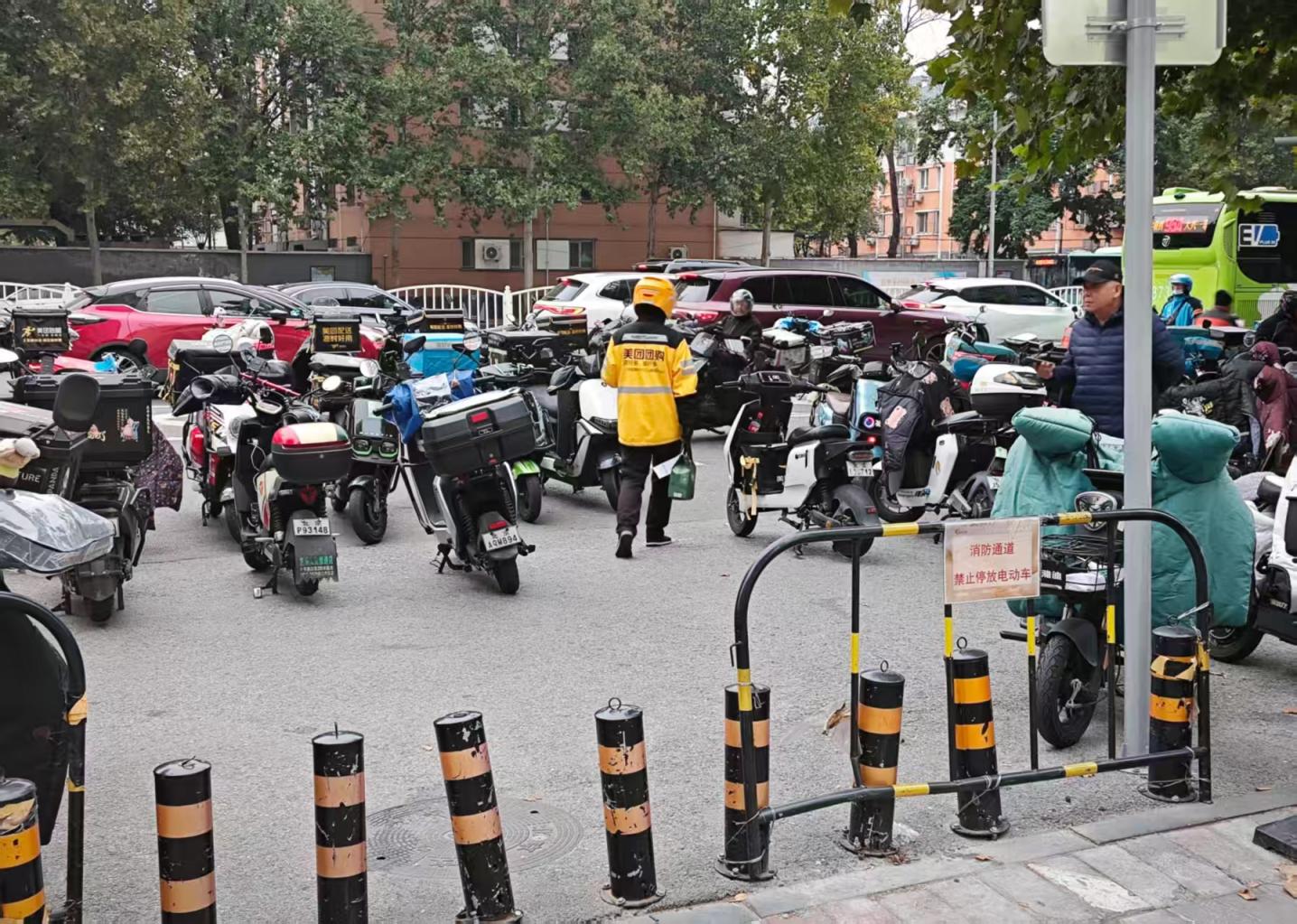 堵住消防通道和非机动车道的大都是外卖电动车。一位骑手道出了其中的无奈:“改造前,不论是去商场取餐还是给楼里的客户送餐,我们都能把车停到广场上。改造后周边停车区变小了,人行便道也经常停着车,我们的车一旦进去就有可能被堵在里面出不来,因此只好占道停车。”