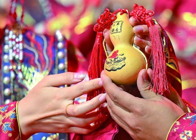 天津,一对新人在集体婚礼上进行合卺礼环节。新华社发