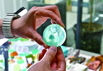 辽宁鞍山,雕刻师在展示一件融合了国潮元素的岫玉作品。新华社发