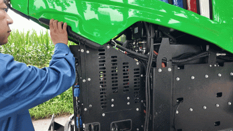 记者来到现场时,这台绿色车身的电动拖拉机正在进行悬挂除草设备的调试。表面看上去和传统拖拉机相似,打开前车盖会发现原本的发动机换成了大型电池组,可以为拖拉机提供90马力的清洁动力。而且,这台拖拉机没有传统的“烟管”,作业时,声音明显减小。