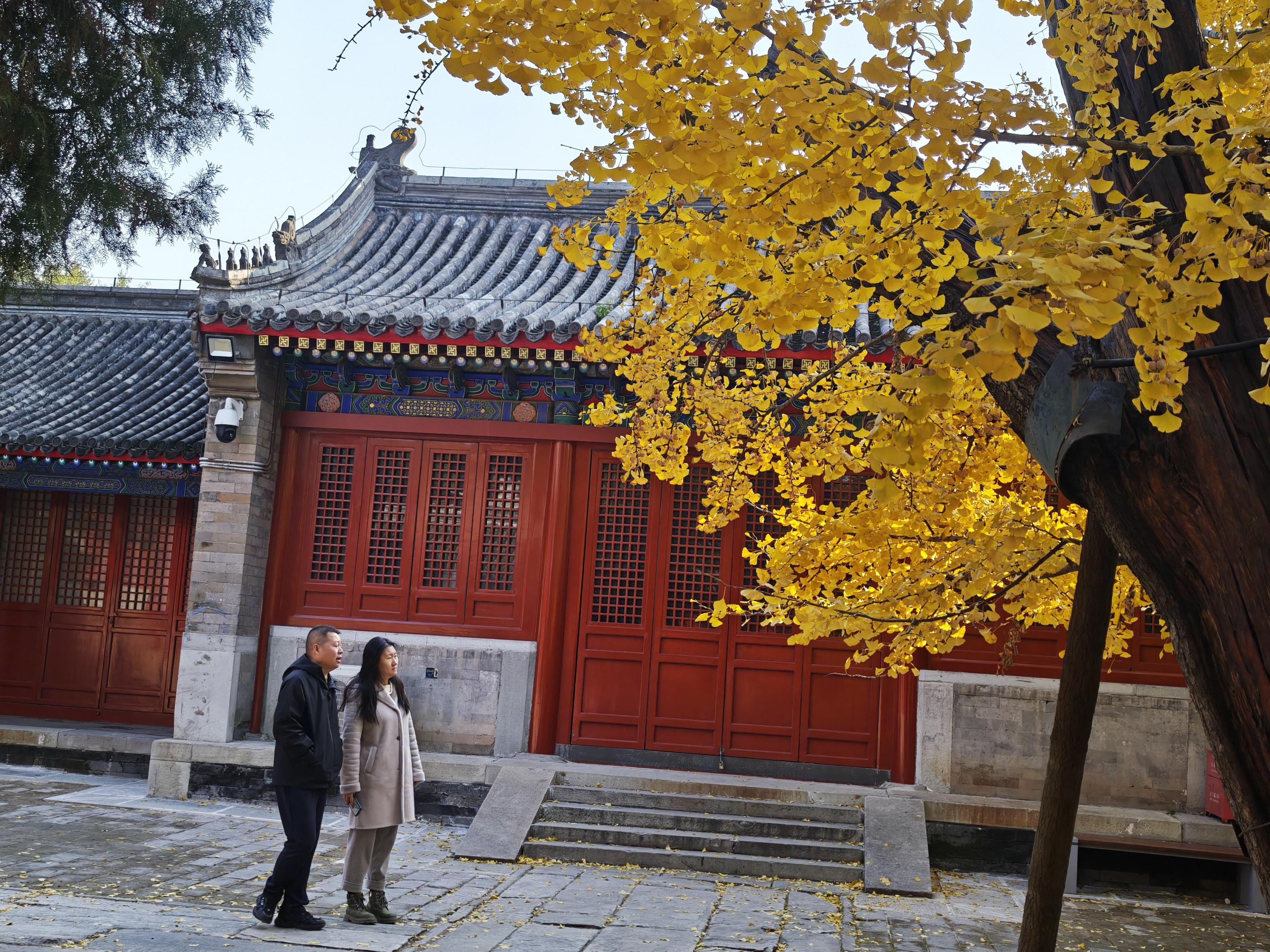 11月3日,位于石景山承恩寺内的百年银杏进入最佳观赏期,金黄色的银杏叶与红墙黛瓦交织出绝美诗意画卷。