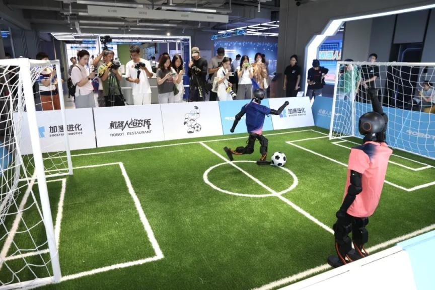 机器人大世界展示场景——足球机器人为观众演示射门。资料图