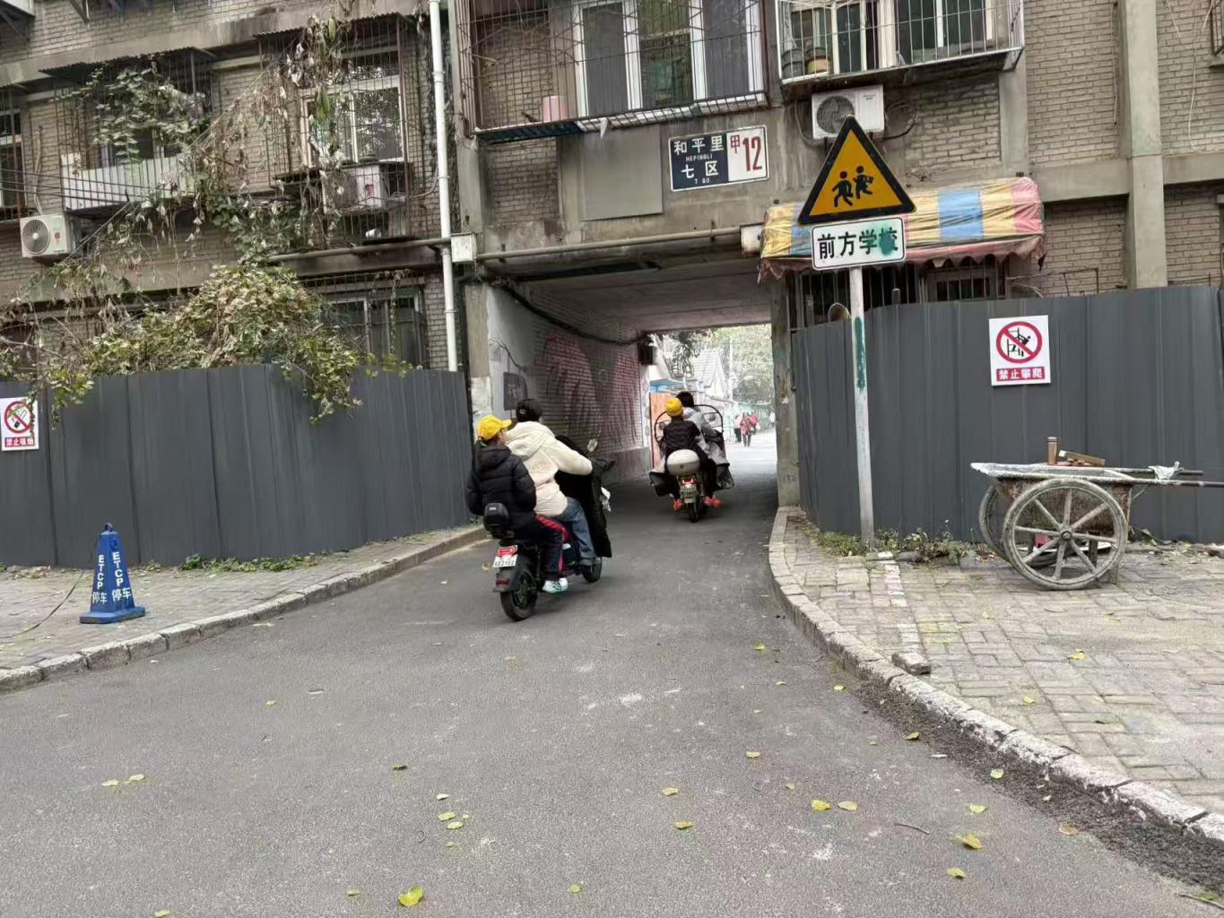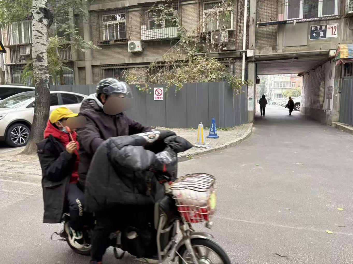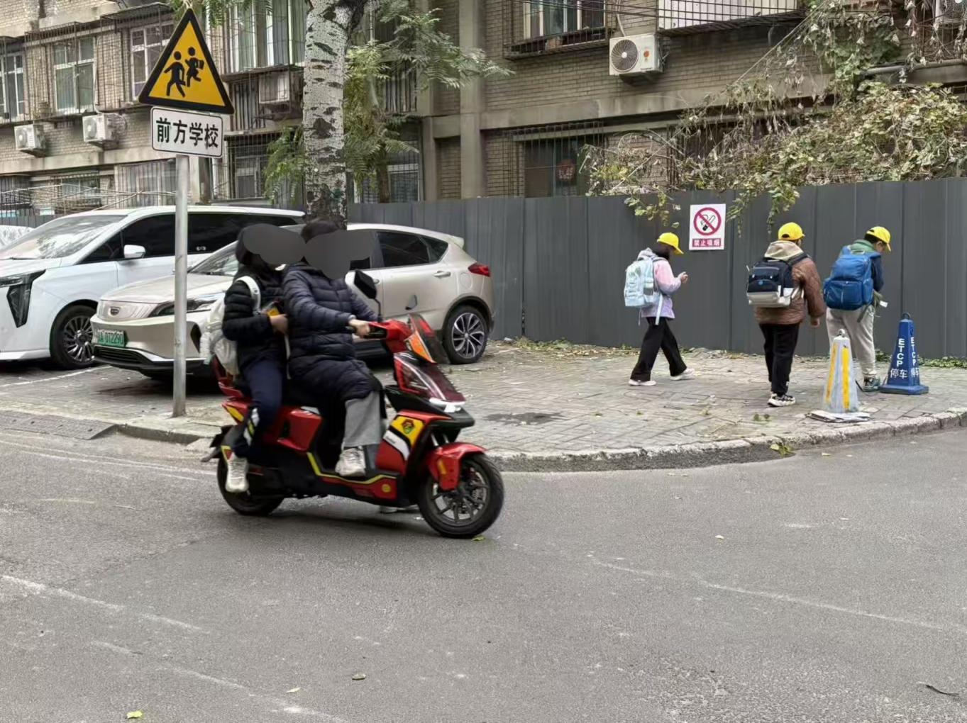 东城区和平里第九小学周边老式居民楼较多,通往学校的道路相对狭窄。早上7时30分左右,不少家长都是骑着电动车送孩子上学。在通往学校的路口处,记者看到不少家长和孩子都没有戴头盔。有一个女孩子坐在电动车后座上,手里还拿着手机看视频。骑车的家长为躲避对面一辆掉头的电动车,不得不紧急刹车,后座上的孩子由于惯性,头部直接撞上了家长的后背,手机也差点掉在地上。