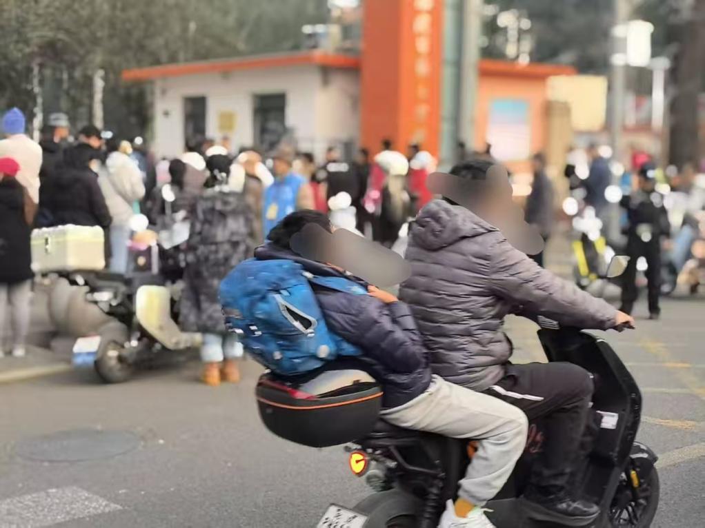 随着校门打开,老师领着学生走出校门,家长一窝蜂地涌上前去,寻找自家的孩子。瞬时间,人流车流混杂,鸣笛声不绝于耳,混乱的人群里还夹杂着外卖车辆。不到10分钟时间,就有超过50辆载着孩子的电动车从记者面前经过。但无一例外,这些电动车上的家长和孩子都没有戴头盔。此外,还有几名家长在电动车踏板上加装了“小凳子”,骑行时就把孩子卡在自己的双腿间,而没有其他防护措施。更令人担心的是,从学校出来向南有一个十字路口,有几名家长带着孩子,在道路上逆行掉头,不等绿灯亮起就骑车直接闯过了路口。