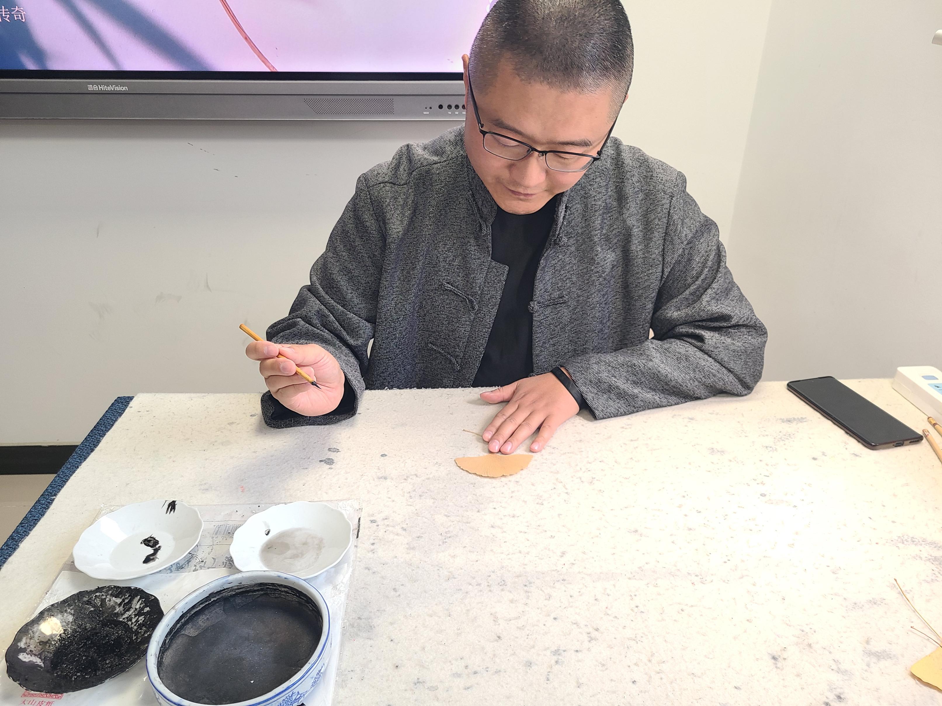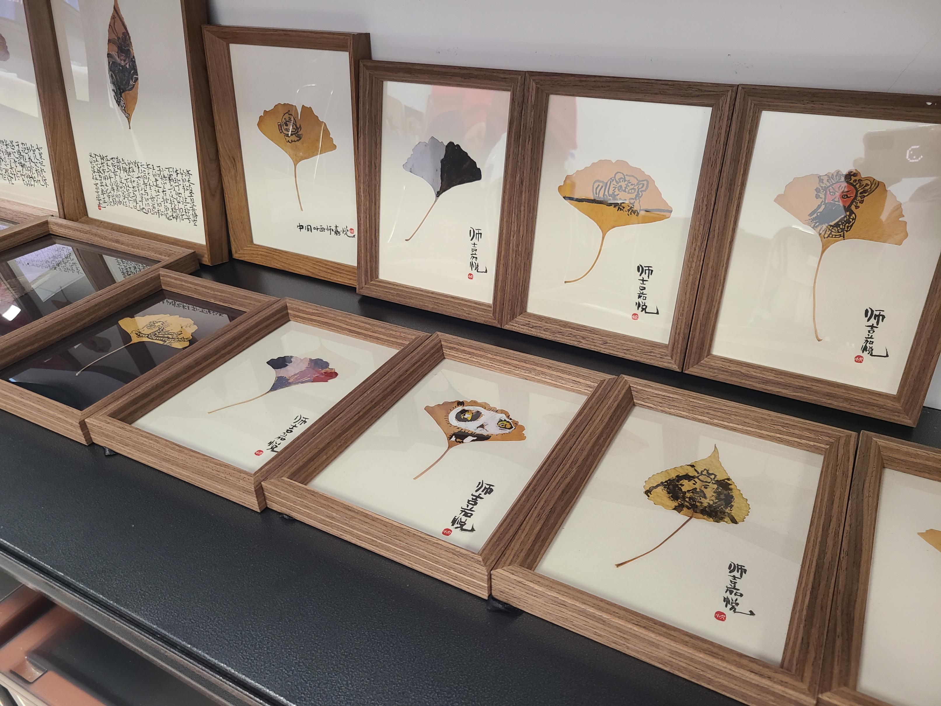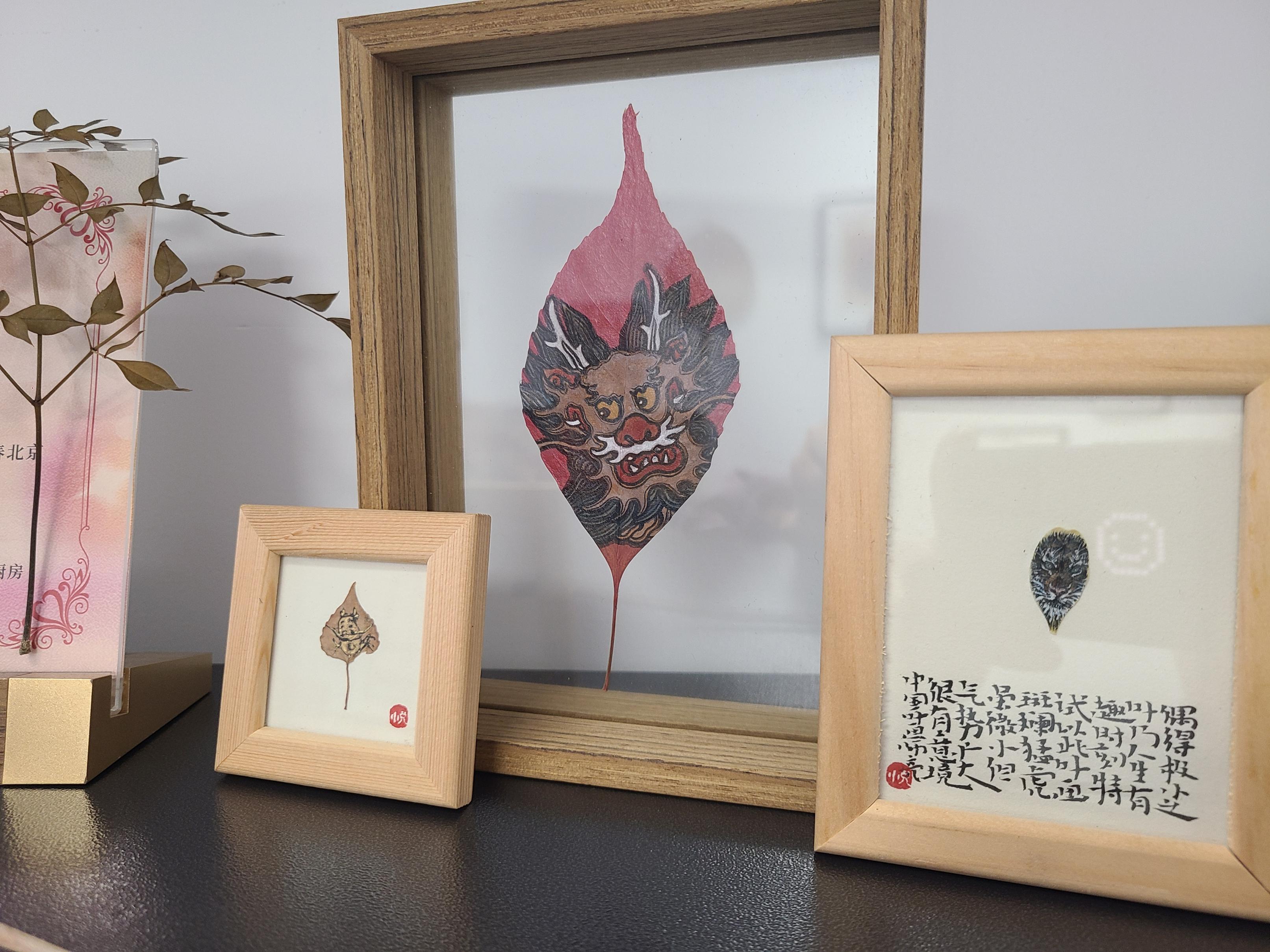 在师亮眼中,菩提叶、银杏叶、杨树叶等各具文化韵味,叶片虽小,但有无限的创作可能。叶片与叶画搭配得当,才是佳作。拿出准备好的树叶,仔细端详叶片形状,再用毛笔斟酌墨量,师亮从容下笔,不到几分钟的时间,一只活灵活现的虾跃然于银杏叶片之上。家族四代传承叶画技艺,作为第四代传承人,46岁的师亮自幼就接触叶画,年轻时拜师多位中国书画名家学习书画技艺,博采众长。师亮这样形容他对叶画的热爱:“创作叶画时,是一种完全投入的状态,我能感受到人与自然的紧密连接,毛笔在叶片上落下的每一笔,都让我感觉是在丈量中华大地。”