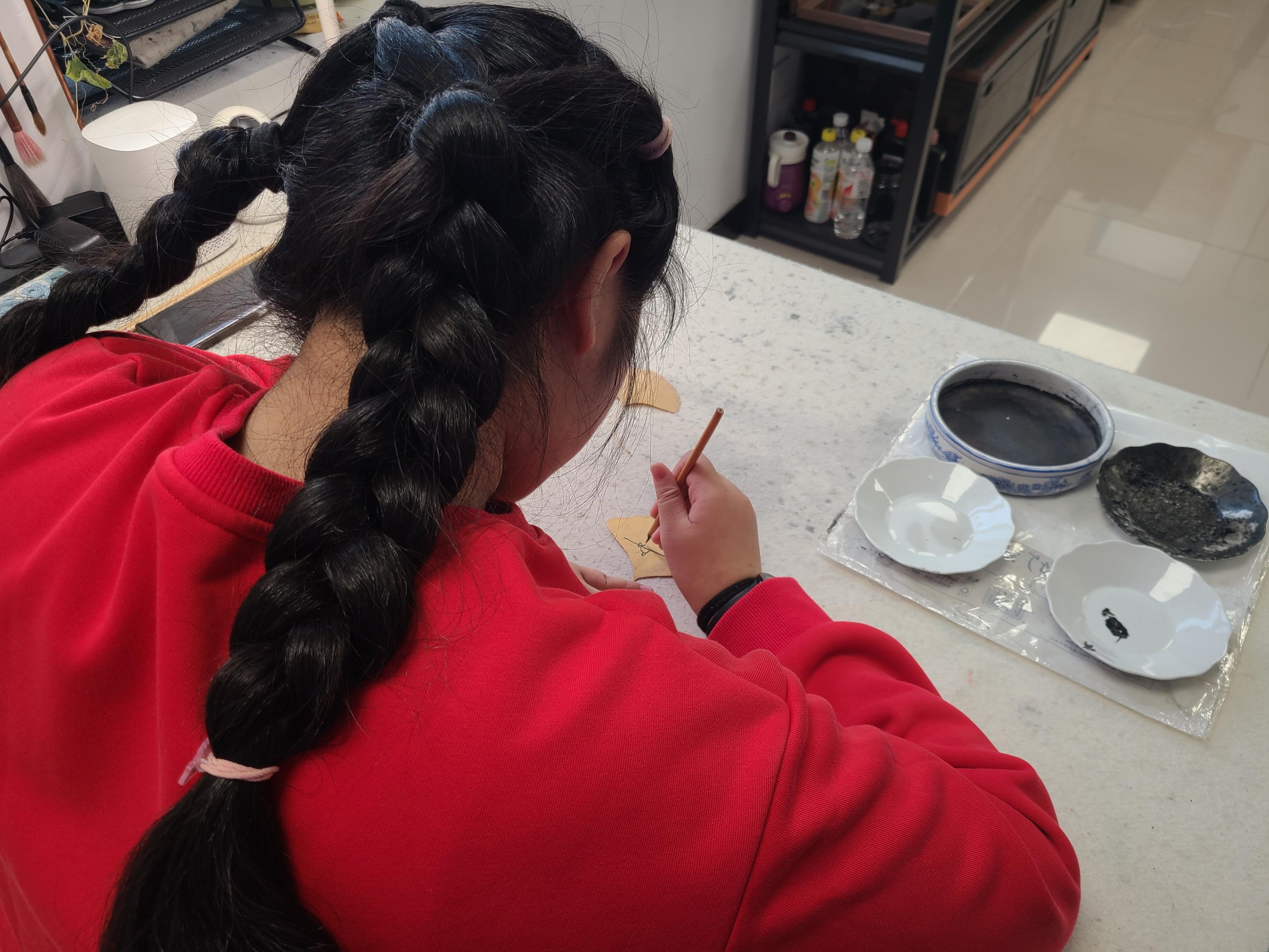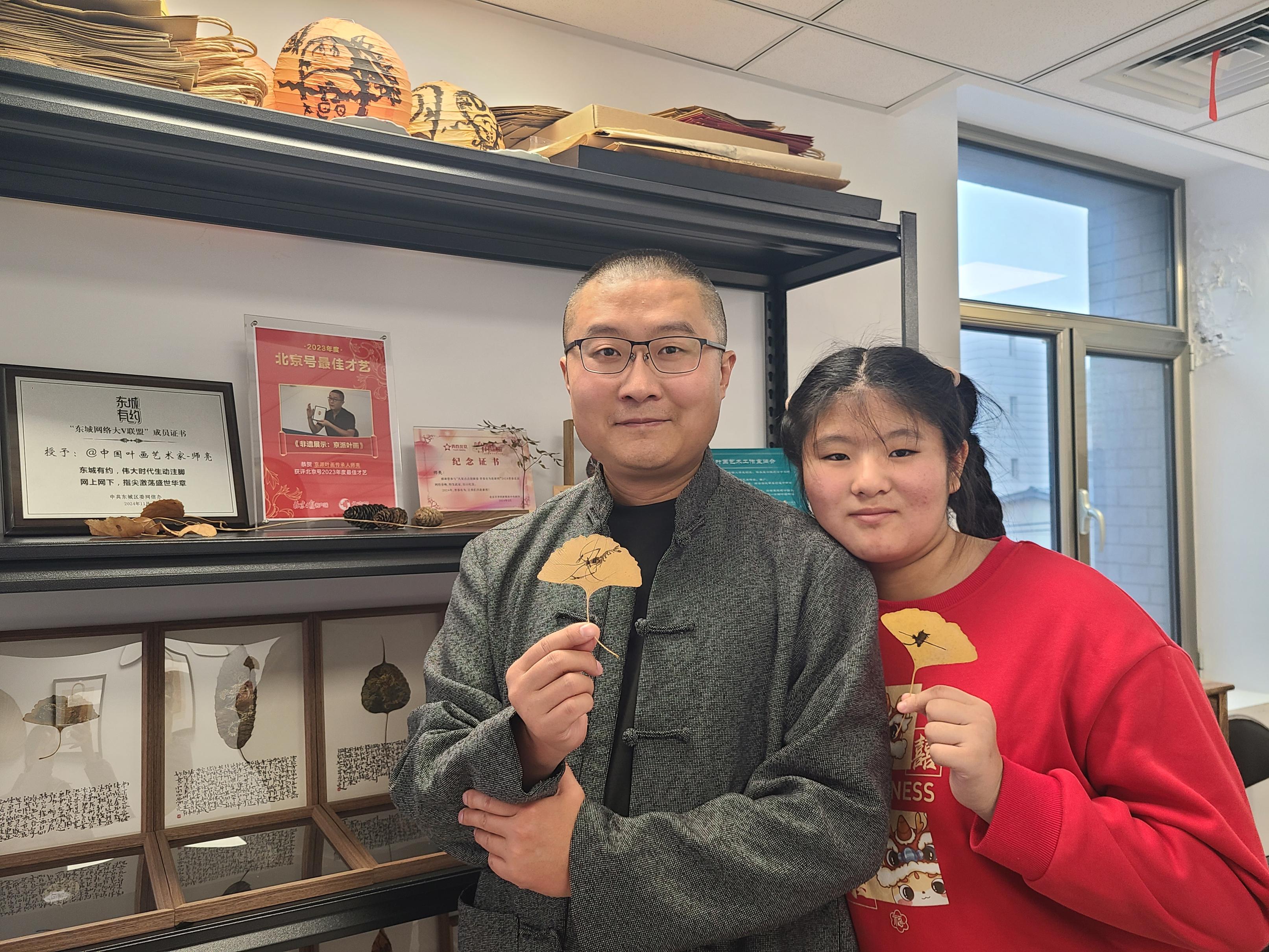 自2020年以来,师亮带着他的叶画作品走上2022年北京冬奥会、中国服贸会、阿联酋“魅力北京非遗风物展”等国内外活动的舞台,乐此不疲地展示并讲解叶画的千年底蕴和艺术魅力。叶画不仅传承技艺,更成为连接不同时代和群体的文化纽带。令人欣慰的是,师亮13岁的女儿师嘉悦受其影响,在学习之余,也开始走上传承叶画之路,钻研叶画技艺,已经成为与他并肩的“好战友”,甚至已有作品被收藏家收藏了。“叶画带我进入了新的世界,获得了宝贵的人生经历和温暖互动。”师嘉悦说,观众的认可成了激发她持续精进的动力。未来,她想在传统与创新的平衡中,逐渐发挥出自己的创作风格,将叶画传承下去。