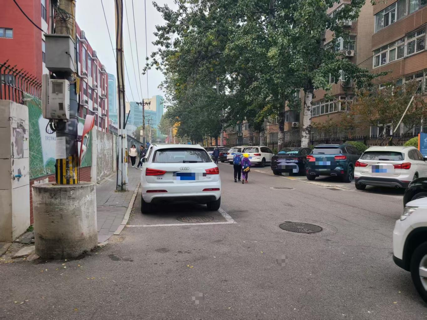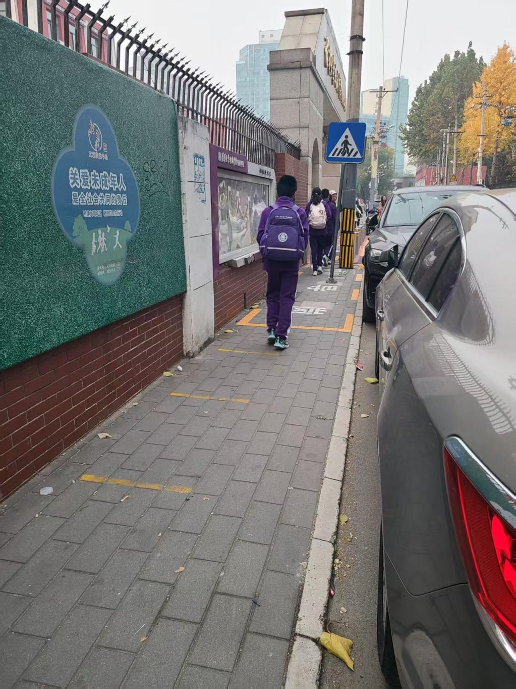 陆续到校的学生走到坑洼路段时,大都放慢了脚步,还有拉着拉杆书包的学生遇到坑洼处不得不费劲地拖拽。也有不少家长紧握着年幼孩子的手,直到平坦处才敢松开。由于只有紧挨学校的一侧有人行道,另一侧停满了车辆,甚至有家长为了躲避坑洼路段,带着孩子直接走上了非机动车道。