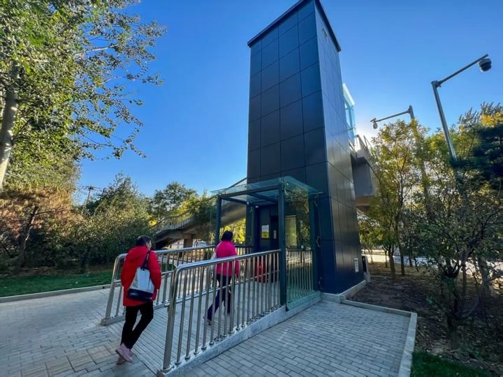 市交通委昌平公路分局在前期调研并与社区沟通的基础上,于2025年7月底正式启动天桥电梯加装工程。项目克服了市政管线复杂、作业空间受限等不利因素,历时3个月,最终在天桥东西两侧各增设一台无障碍直梯。每台直梯可载客13人,运行时间为6时至22时30分,出入口处均设有无障碍坡道和安全扶手。