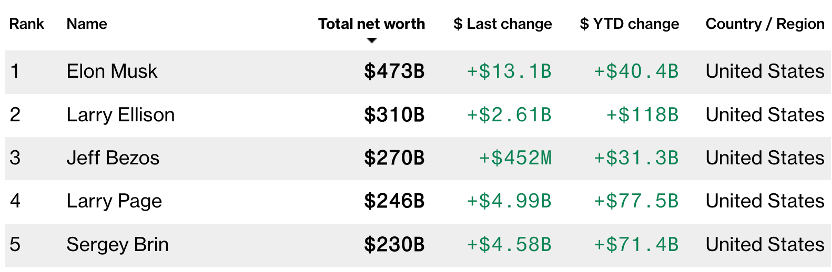 最新的彭博亿万富豪指数显示,马斯克以4730亿美元的身家位居全球首富,且已大幅度超越位居第二的甲骨文创始人拉里·埃里森。