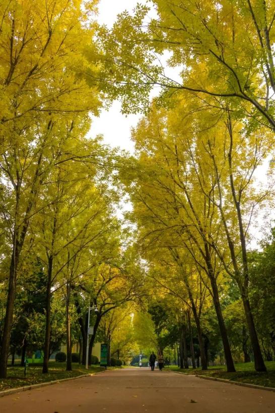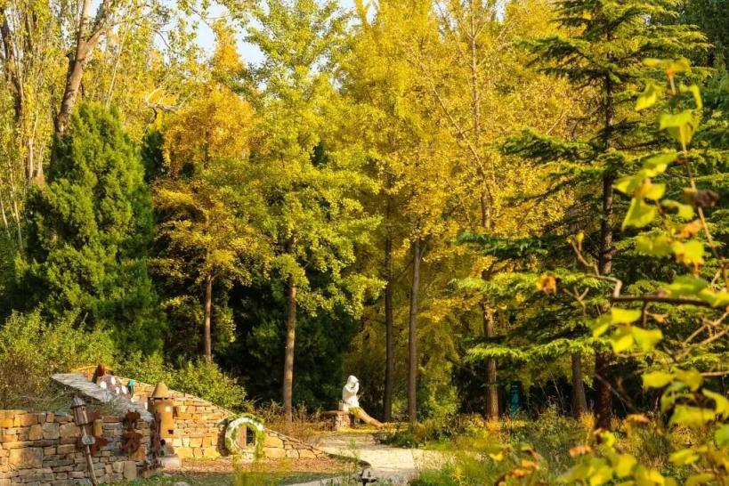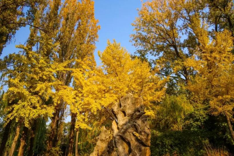 数十株高大银杏组成银杏林,秋季叶色金黄、落叶缤纷,在阳光下更为耀眼。