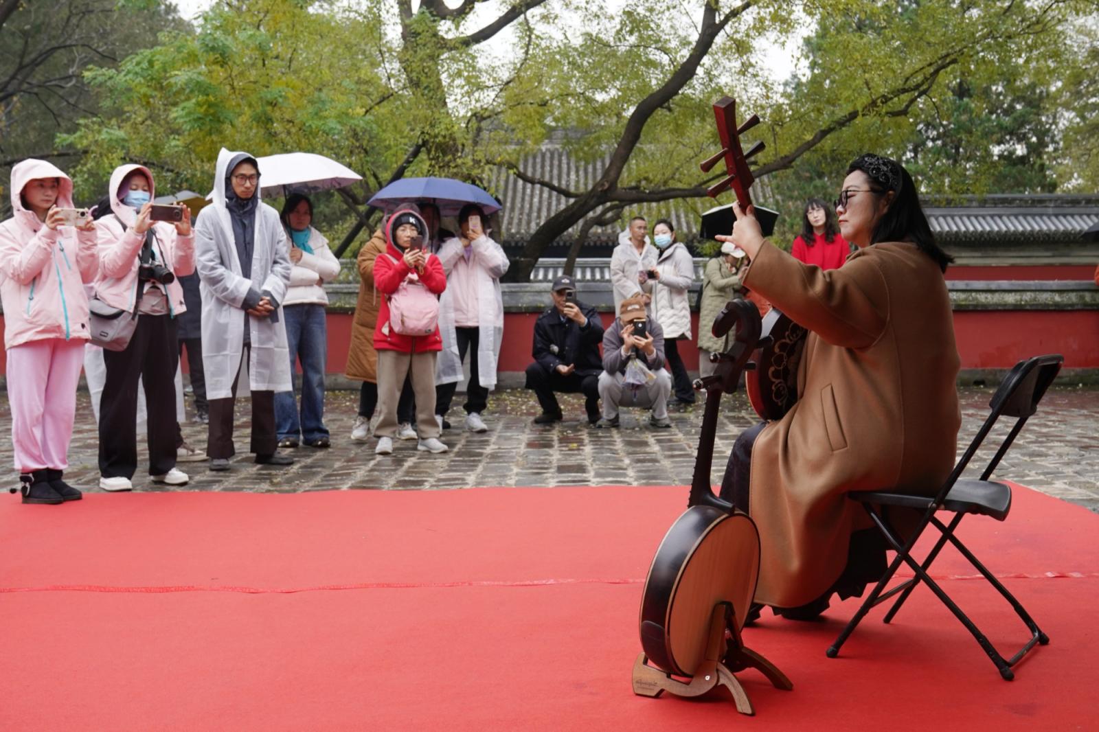 “镗——镗——镗——”三声钟鸣穿越庭院,古建音乐会开始了。二胡的婉转遇上扬琴的清亮,在古寺间回荡,循声而去,来自中央音乐学院的演奏家张雪与季森用琴弦交织奏出《喜看麦田千层浪》《空山鸟语》等经典曲目。“立冬时节,万物内敛,这首曲子恰好诠释了这份沉静之美”,演奏间隙,演奏家还向观众进行了讲解,让观众从旋律中读懂了节气与音乐的共鸣。中央民族歌舞团民乐团团长马兰花抱着阮琴登场。指尖划过琴弦,醇厚的阮音与古寺的静谧完美相融,仿佛穿越千年时光。