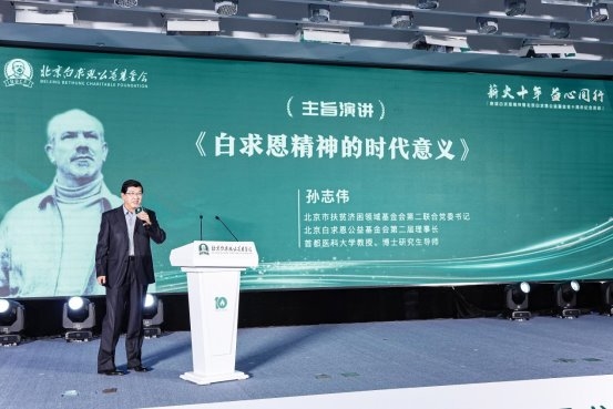 北京市扶贫济困领域基金会第二联合党委书记、北京白求恩公益基金会第二届理事长孙志伟教授在《白求恩精神的时代意义》主旨演讲中,从“为什么要学习白求恩”“白求恩精神的内涵”以及“白求恩精神的时代意义”三个层面,系统阐释了白求恩精神的文化内涵与当代价值,并指出公益的“利他性”与白求恩“毫不利己,专门利人”的精神内核高度契合。他强调,白求恩精神是先进文化和精神高地,具有跨越时空、行业、民族及意识形态的永恒魅力,是中华民族之魂的组成部分,应在新时代继续发扬光大,为民族复兴贡献力量。