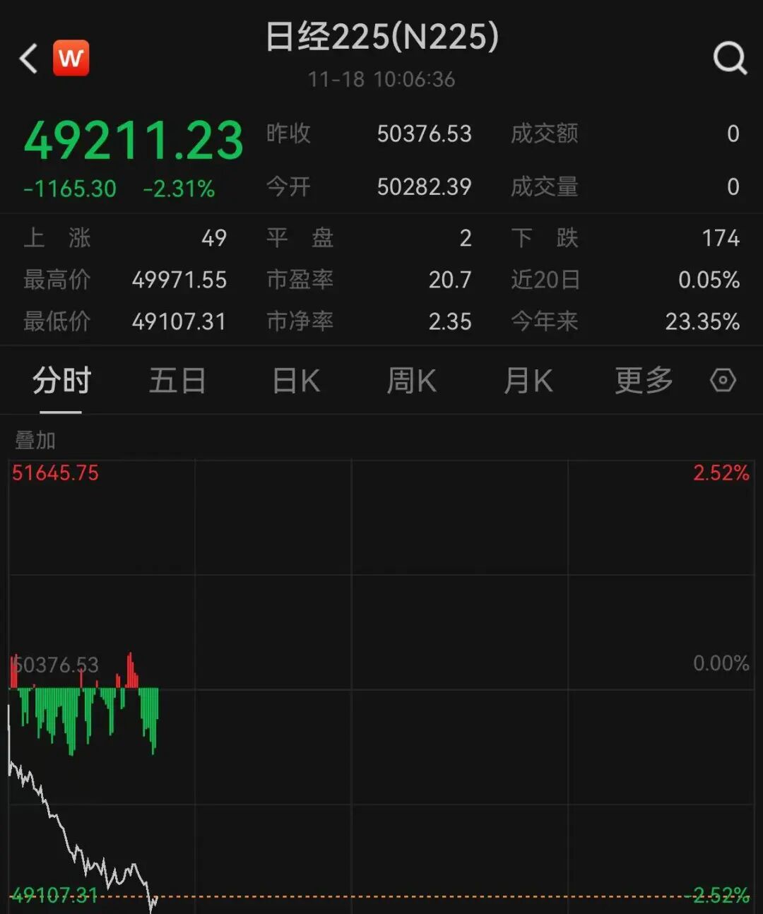 18日,日经225指数、东证指数均大幅低开,半导体和人工智能相关行业走低,信息通信和银行股也表现疲软。截至发稿,日经225指数跌超千点,跌幅超2.3%。