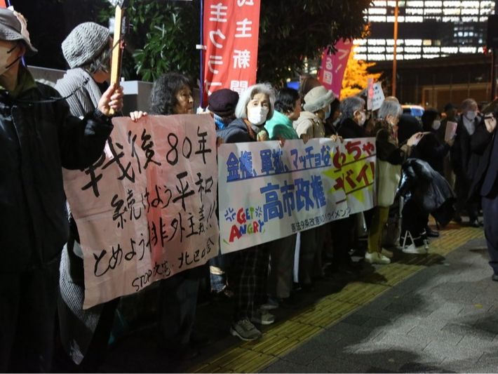 数十个日本民间团体共同发起了25日的抗议。“继承和发展村山谈话会”理事长藤田高景在现场告诉记者,他们在此集会,就是要发出最明确的反对声音。高市必须撤回这种错误言论,向国民道歉,不能再挑起可能导致冲突的紧张局势。