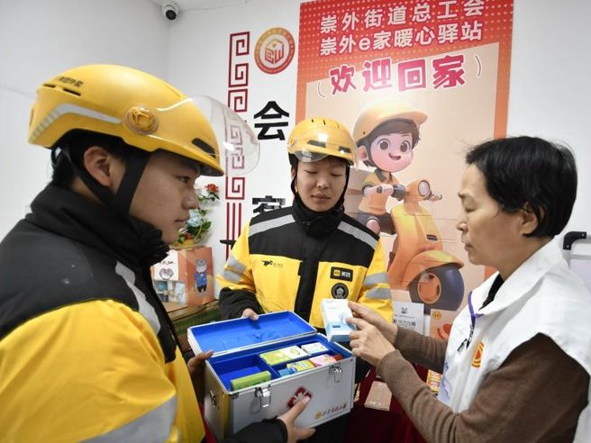 11月26日,东城区崇文门外街道“崇外e家”的工作人员为外卖配送员提供应急药品。新华社记者 李欣 摄