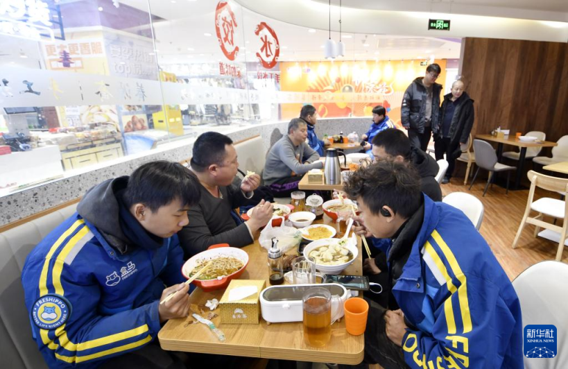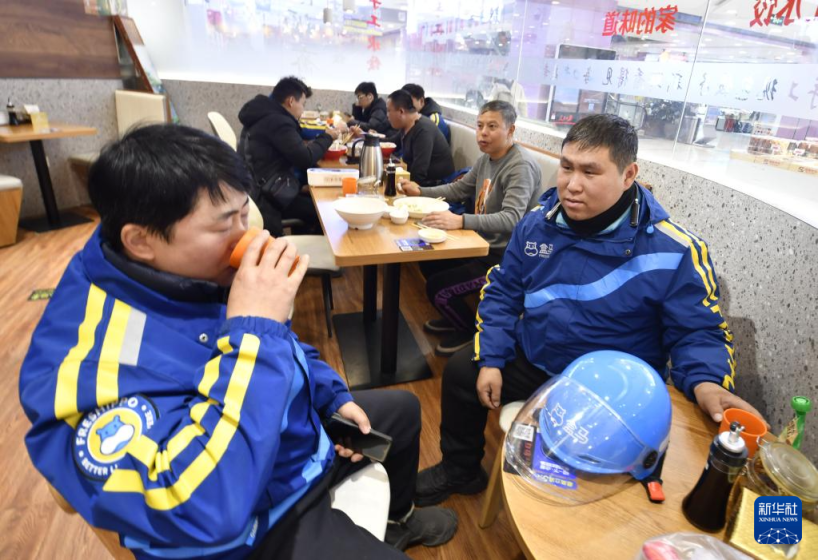 11月26日,几名外卖配送员在东城区崇文门外街道一家为他们提供优惠餐饮的爱心饺子馆吃饭。新华社记者 李欣 摄
