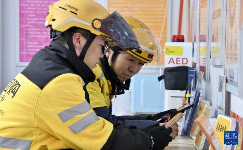 11月26日,几名外卖配送员来到东城区崇文门外街道的“崇外e家”休息。新华社记者 李欣 摄