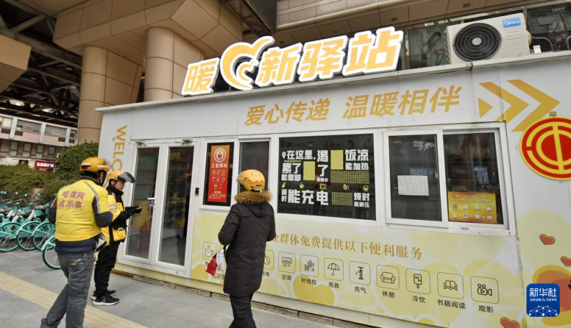 11月26日,几名外卖配送员来到东城区崇文门外街道的新世界“暖新驿站”休息。新华社记者 李欣 摄