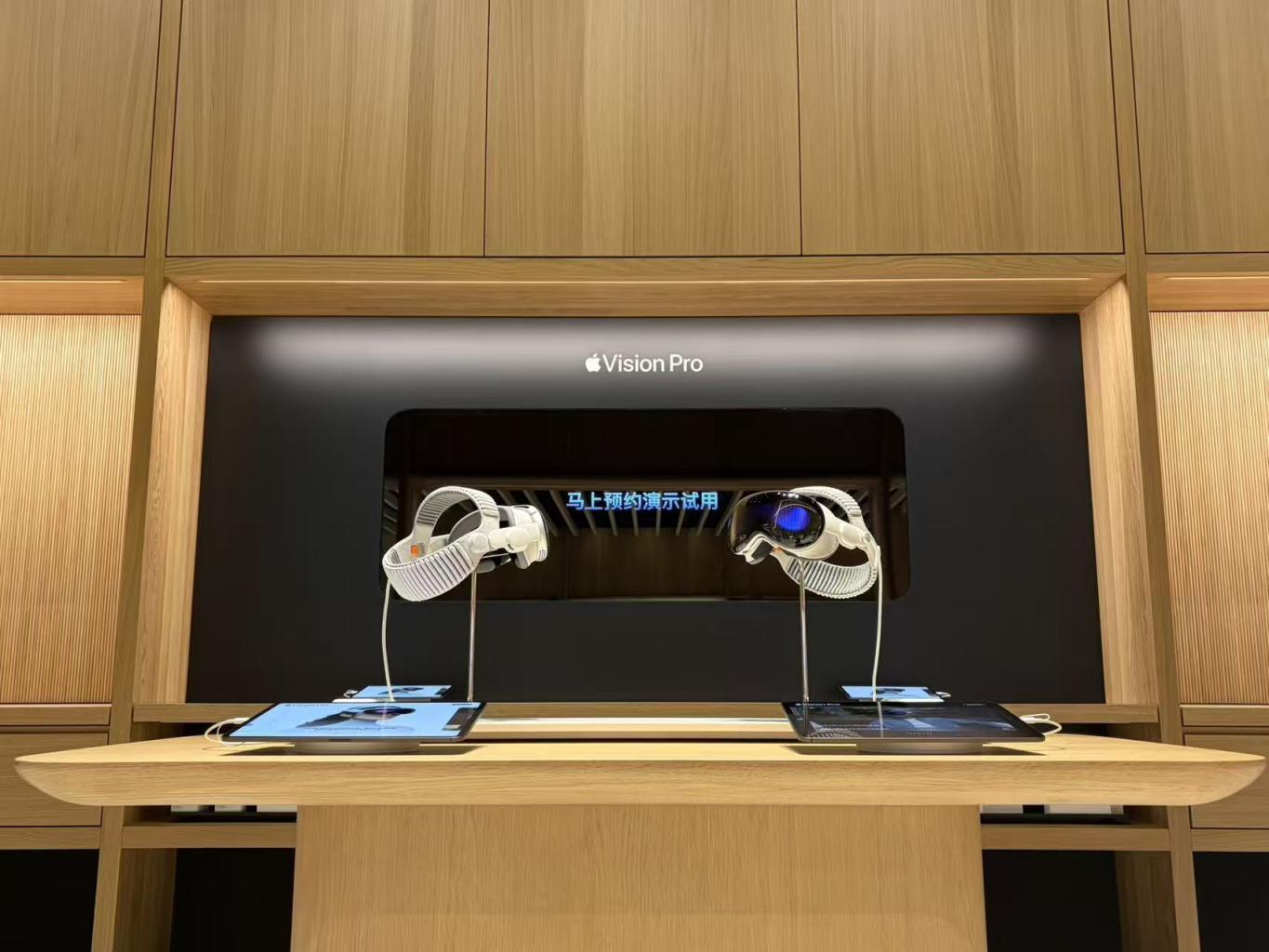 这家全新门店,是苹果在北京的第六家零售店。店面采用通用设计原则和可持续材料建造,是北京首家采用该设计的苹果店。走进店内,明亮的灯光下,产品展示桌整齐排列。最引人注目的,当数靠内侧的Apple Vision Pro专属体验区。顾客通过预约,便可沉浸式感受空间计算和沉浸式视频体验的魅力。