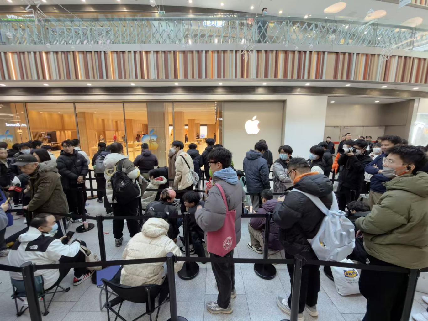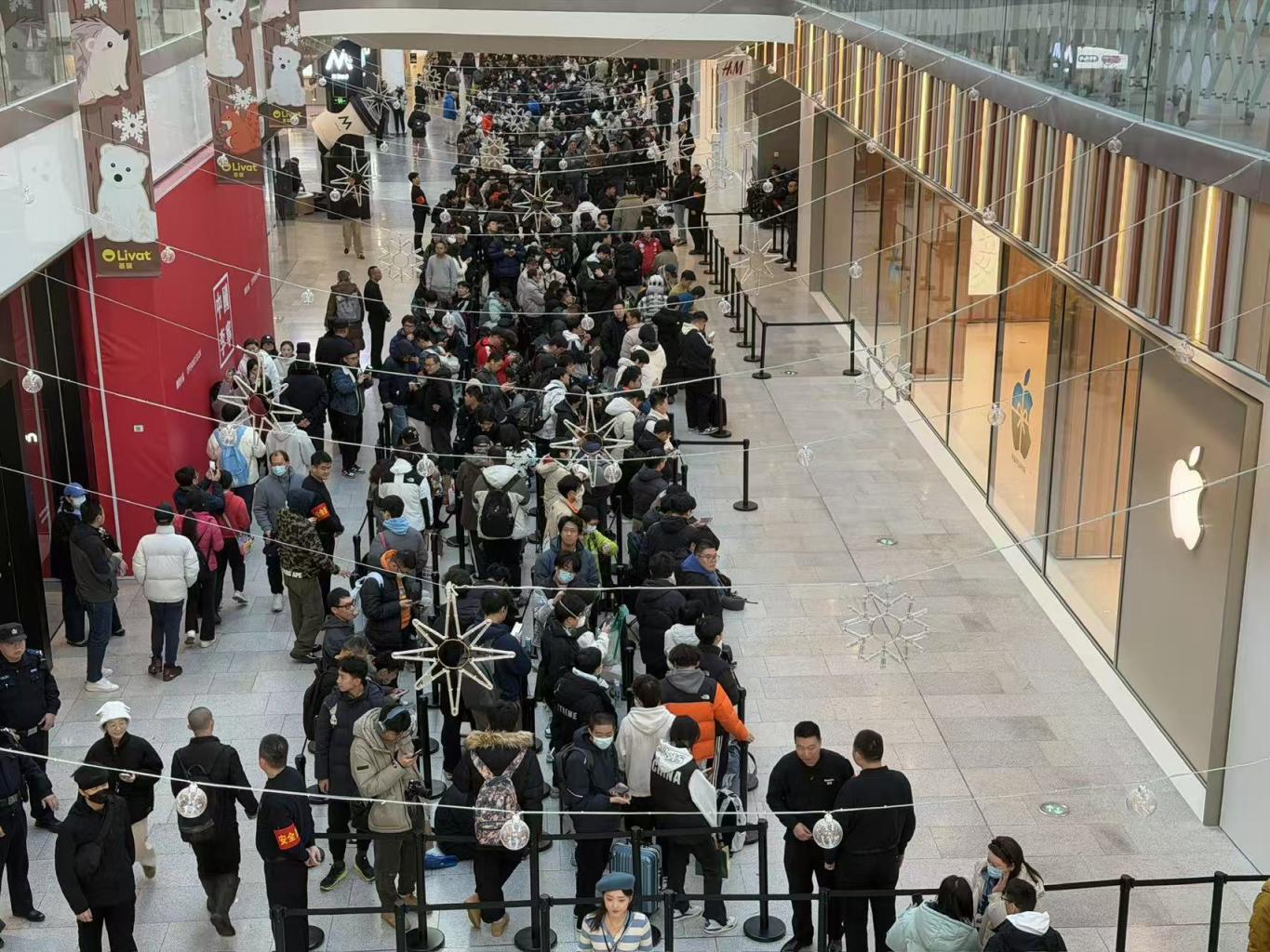 12月6日上午九点半,大兴荟聚一层中庭已排起蜿蜒长龙。十点整,苹果店门开启,首批顾客兴奋涌入。他们不仅为最新产品而来,也为领取一份特别的开幕纪念——定制帆布袋和贴纸,为新店开业增添了一份仪式感。
