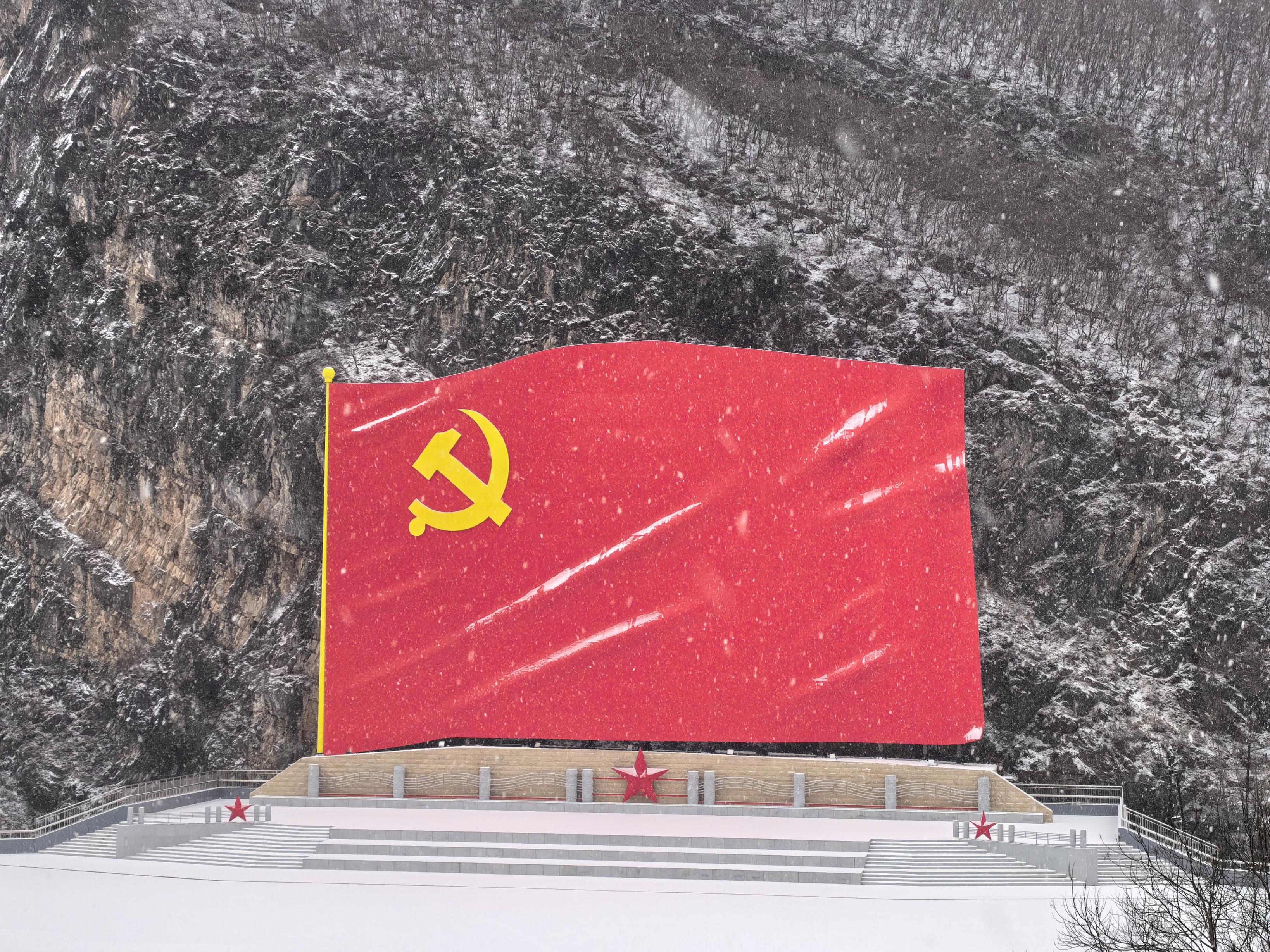 房山霞云岭乡堂上村,雪的洁白更衬旗的鲜红