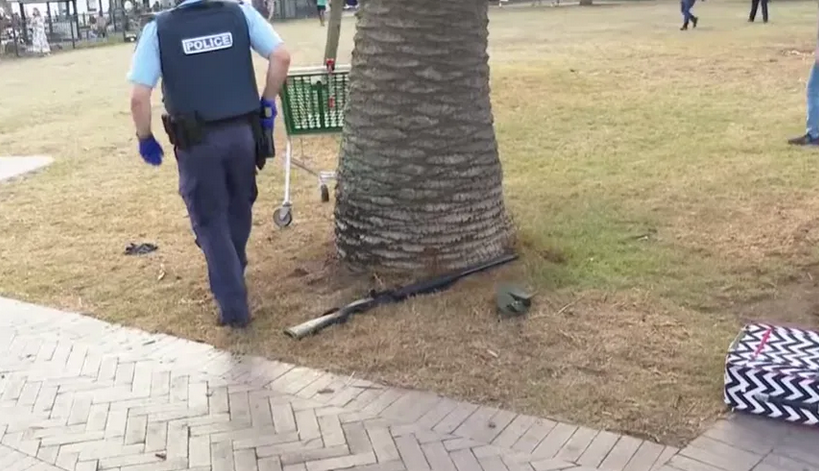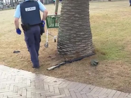 在警戒区域内,地面可见一顶棒球帽和疑似一支霰弹枪,警员在旁值守。(ABC)