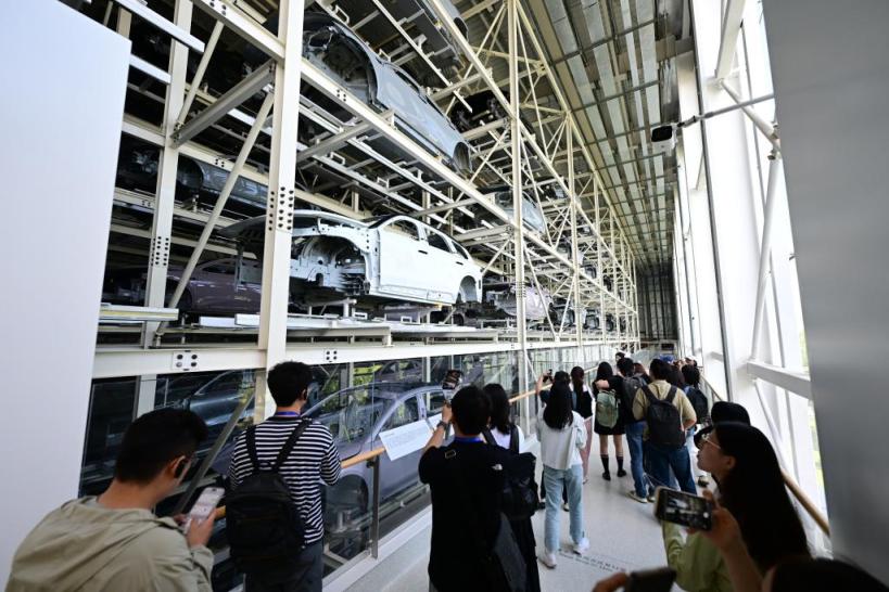 在合肥市新桥智能电动汽车产业园蔚来第二工厂,媒体记者参观“魔方”车辆存取平台。新华社记者 周牧 摄