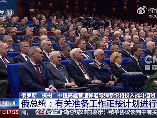 俄罗斯《消息报》12月18日报道,当地时间12月17日,俄罗斯总统普京在国防部部务委员会扩大会议上宣布,俄罗斯“榛树”中程高超音速弹道导弹系统将于今年年底前投入战斗值班状态,有关准备工作正按计划进行。