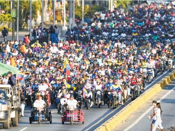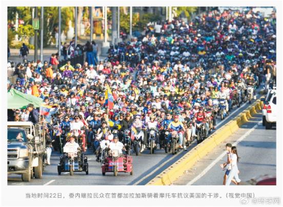 据委内瑞拉南方电视台22日报道,当天委内瑞拉工会、社区组织及摩托车团体在加拉加斯举行了一场大规模摩托车车队抗议活动,许多参与者身着海盗服装,以此讽刺和谴责“美帝海盗行径”。