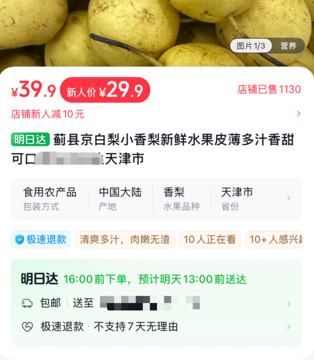 “东北京白梨新鲜东北特产,软绵多汁甜梨子”“蓟县京白梨小香梨新鲜水果皮薄多汁香甜”“河北鸭梨正宗京白梨”……在部分电商平台,一些商家打着“京白梨”的名号,卖的却并非北京门头沟产的梨果。点进商品详情页,可以看到产地和发货地多标注为河北、辽宁等地,每斤售价在6至9元之间,部分商品销量已达上千单。