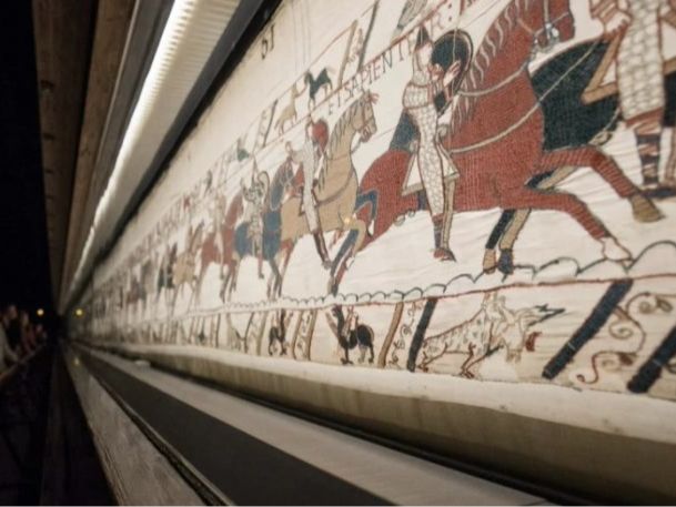 “巴约挂毯”长约70米,高约50厘米,以中世纪连环画的形式,生动记录了1066年法国诺曼公爵威廉一世征服英国、加冕英格兰国王的历史,具有极高的艺术价值和史料价值。这张挂毯以刺绣的方式呈现了史料中的重要场面、人物和武器器具,历经数百年仍清晰可辨。“巴约挂毯”现藏于法国巴约挂毯博物馆中,是当地最有名的古代文物。据法国新闻台报道,历史上“巴约挂毯”仅有2次外借,第一次是1803年应拿破仑要求在巴黎展出,第二次是1945年在卢浮宫展出。