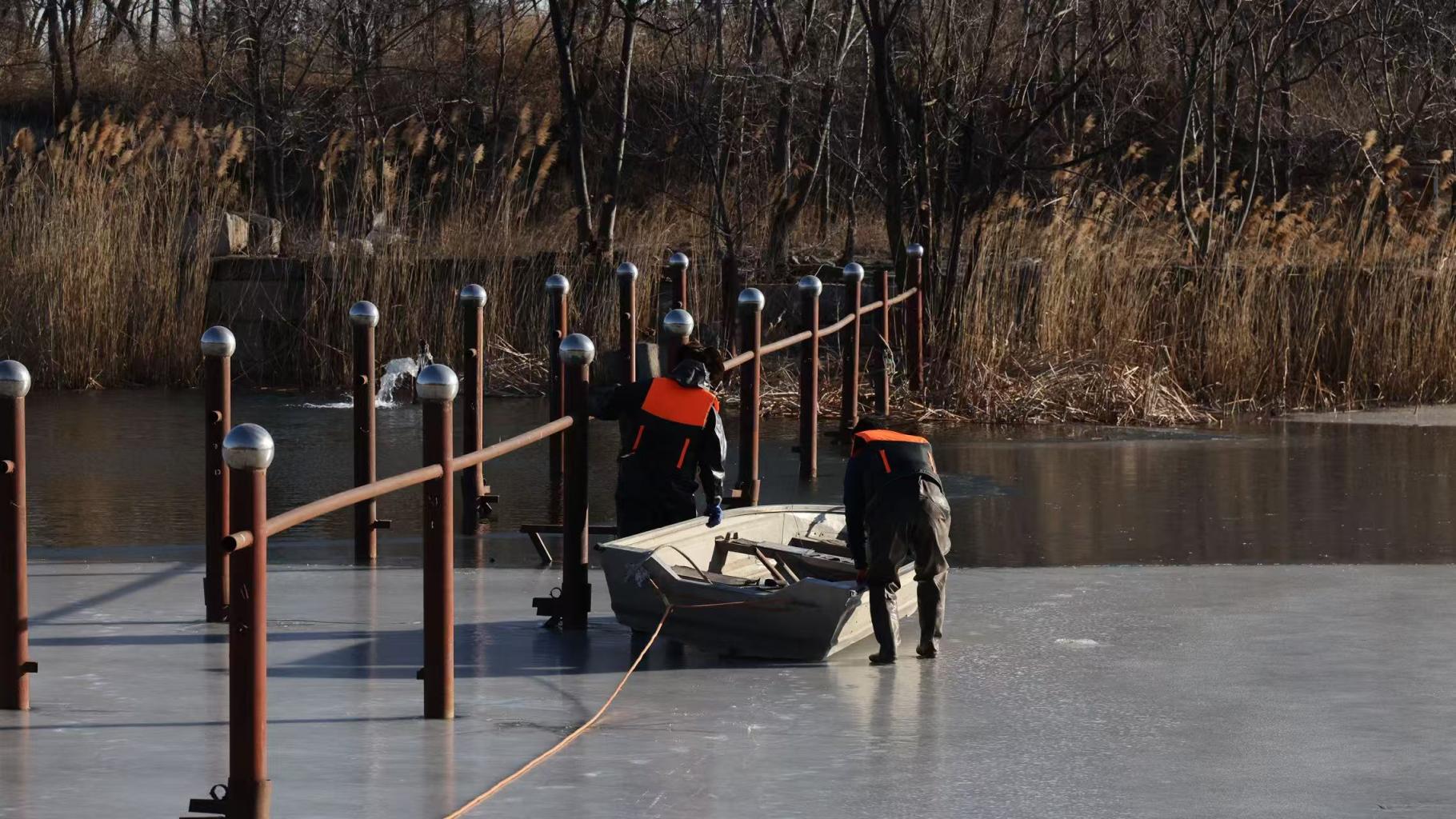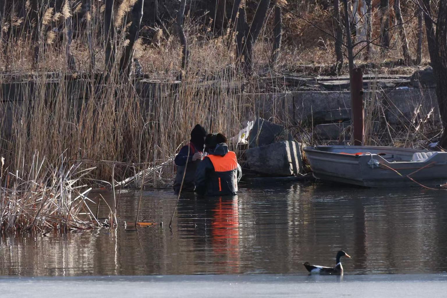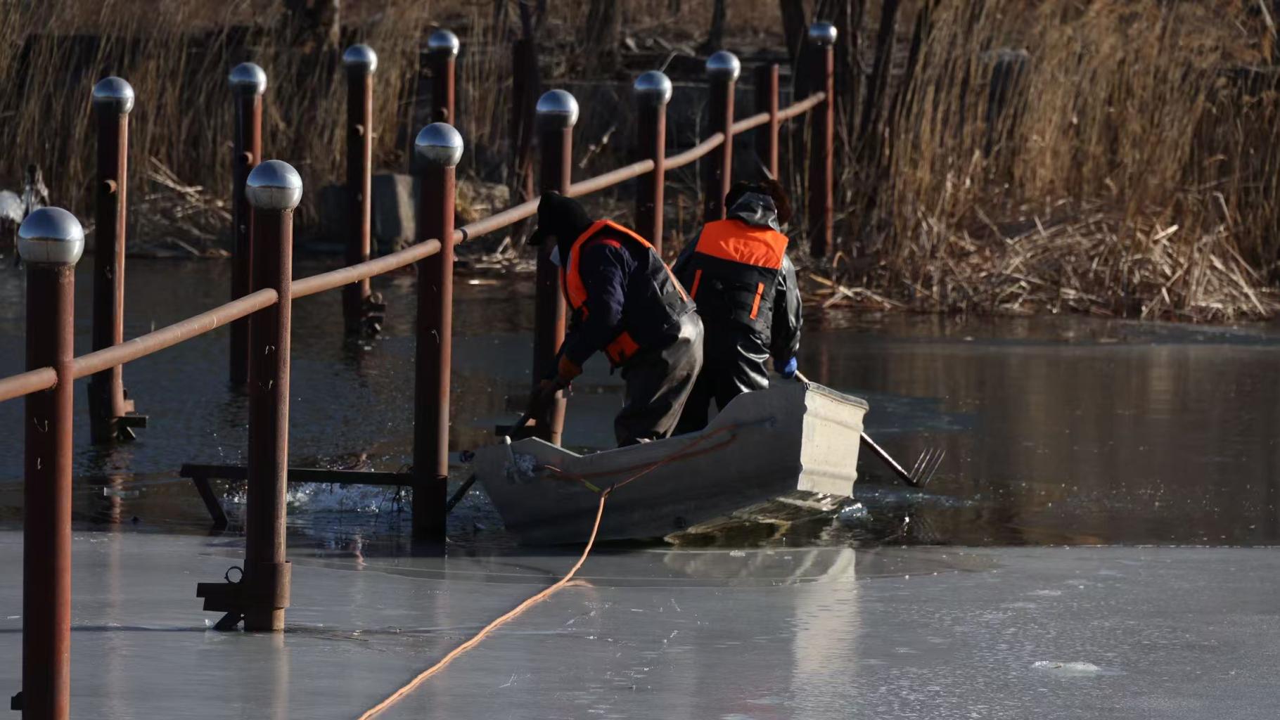 市民徐女士目睹了这一幕:12月23日上午10时40分左右,两位穿着救生衣、防水裤的工人师傅推着船在冰面上前行,等船挪到水泵附近后,师傅们弯着腰用工具一点点敲碎周围的薄冰,把船划进没结冰的水里。接着,他们进入了刺骨的湖水中,在齐腰深的水里合力抬起水泵,缓缓将水泵安置在离鹅窝更近的位置。