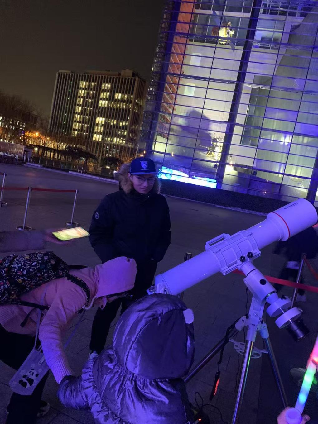 广场一侧,“星辰之眼”天文观测活动正在进行。4架天文望远镜依次排开,大小爱好者无畏冬夜的寒冷,排队等候着探索星空。透过专业设备,跨年夜的美丽月球褪去了神秘的面纱,月海、环形山,一览无余。