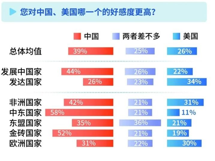 《环球时报》29日公布的一项覆盖全球46个国家、5.17万民众的《2025年中国国际形象全球调查报告》,揭示了一个标志性的变化:当被问及“对中美两国哪一个好感度更高”时,国际民意选择中国的比例达到39%,首次显著超过选择美国的比例(26%)。一年之内,中国所获支持上升9个百分点,而美国则下降约8个百分点。