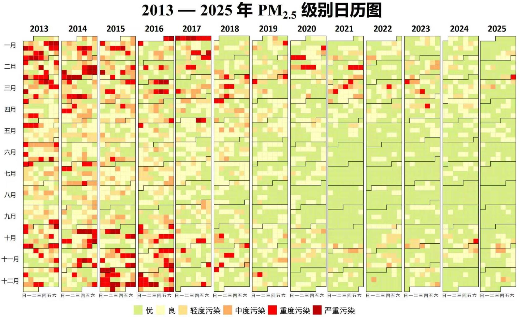 值得注意的是,与蓝天关系最密切的指标是PM2.5,2025年,PM2.5优良天数达348天,较2013年增加了144天,多了近5个月,PM2.5优良天比率从55.9%提高到95.3%。尤其是2025年3月至10月,PM2.5连续227天保持优良水平,好天持续了近8个月,远超2013年的13天,为有监测以来最多。蓝天成为常态,是看得见的幸福,成为首都老百姓最有获得感的一件事。