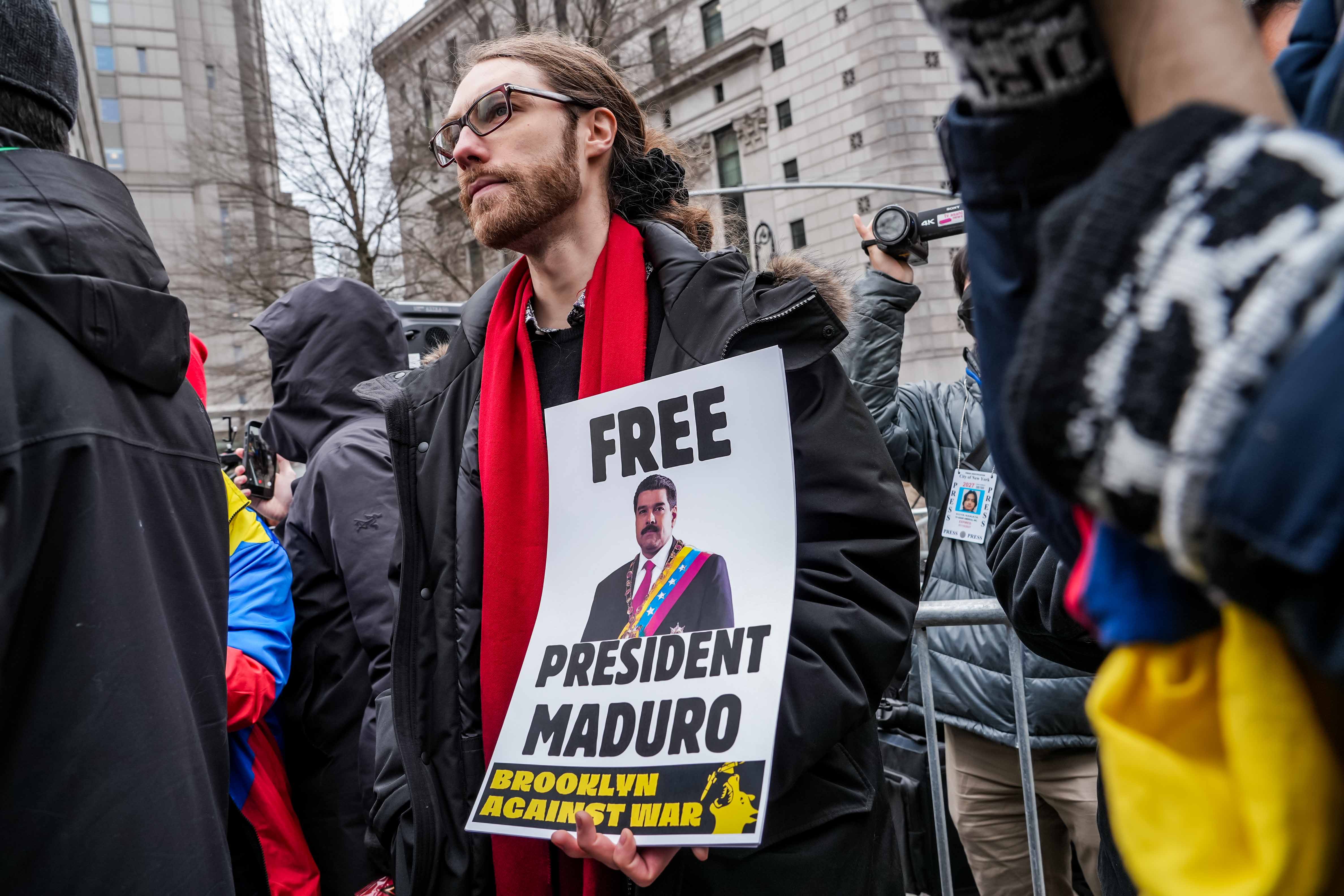 法院外,抗议者聚集,呼喊口号,要求释放马杜罗,抗议美国军事干涉委内瑞拉。一些人举着“释放马杜罗总统”“不要向委内瑞拉开战”“停止对委内瑞拉的非法战争”等标语横幅。