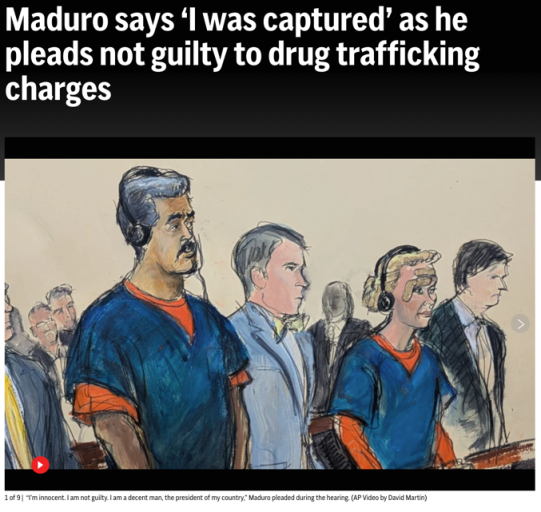 1月5日,遭美国强行控制的马杜罗和妻子弗洛雷斯在纽约南区联邦地区法院首次出庭。这位委内瑞拉总统对美方的“指控”表示不认罪。