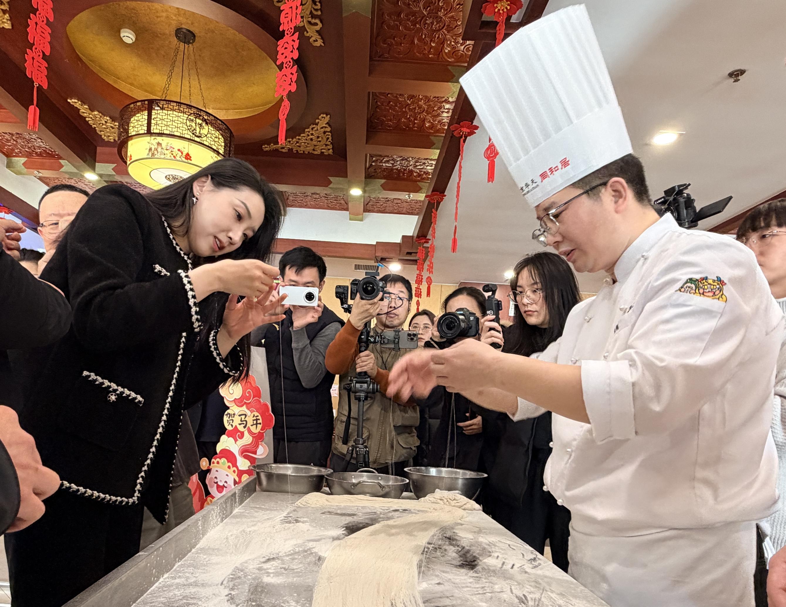 活动现场,孙楚泊手持竹笛吹响一曲《福到万家》;同和居的首席面点师张刚则随乐曲节奏展示起抻面绝技,一团面在他手中抻、拉、抖、摔。一曲奏罢,面团历经14扣抻拉,已变为1.6万余根细如发丝的龙须面。孙楚泊拿起一根细针,随手拈起一根面,便能轻松穿过针眼。“这不仅是手艺,更是艺术!这就是非遗技艺的精湛与传承人的匠心!”孙楚泊赞叹道。