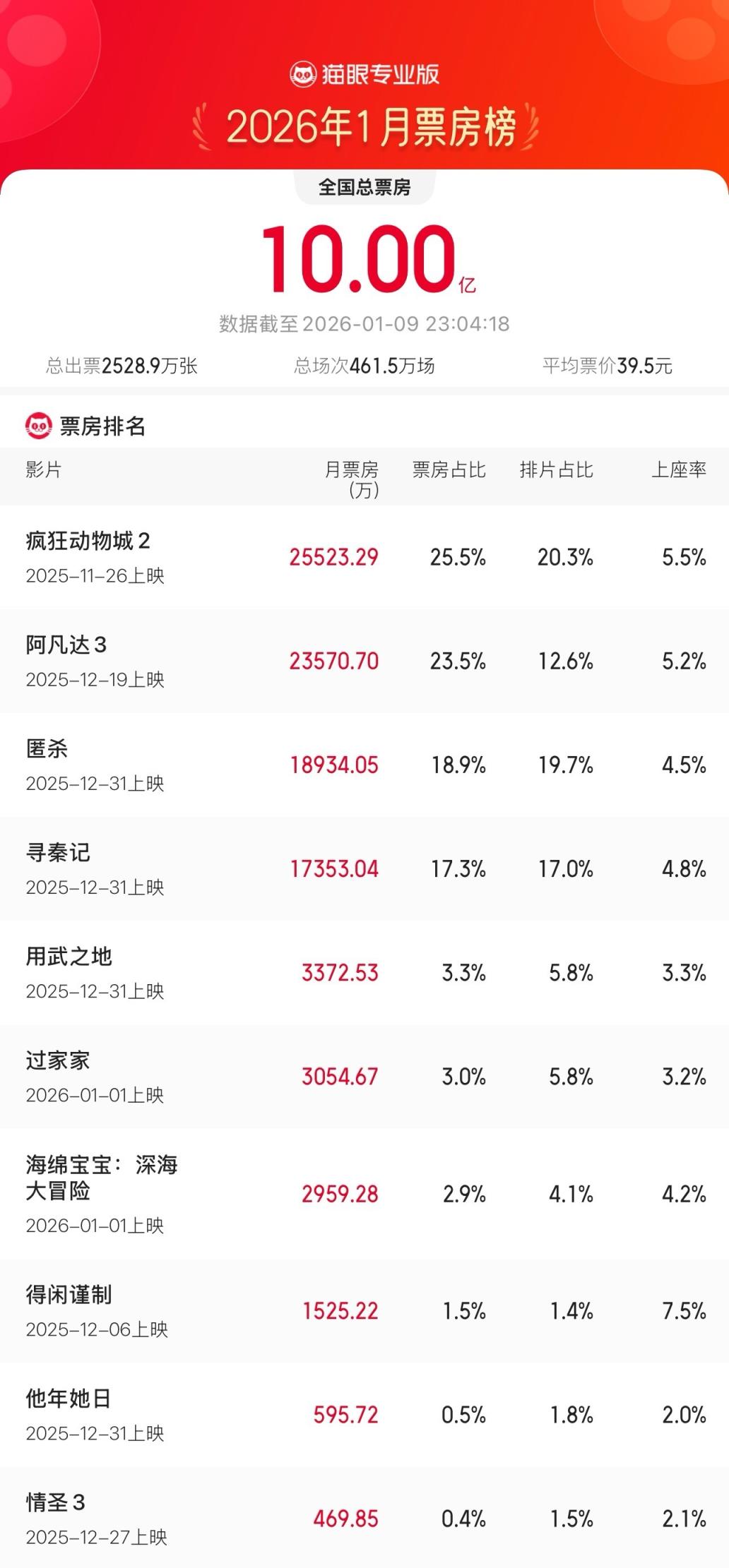 据猫眼专业版数据,1月9日23时04分,2026年1月总票房破10亿,《疯狂动物城2》《阿凡达3》《匿杀》分列1月票房榜前三位。