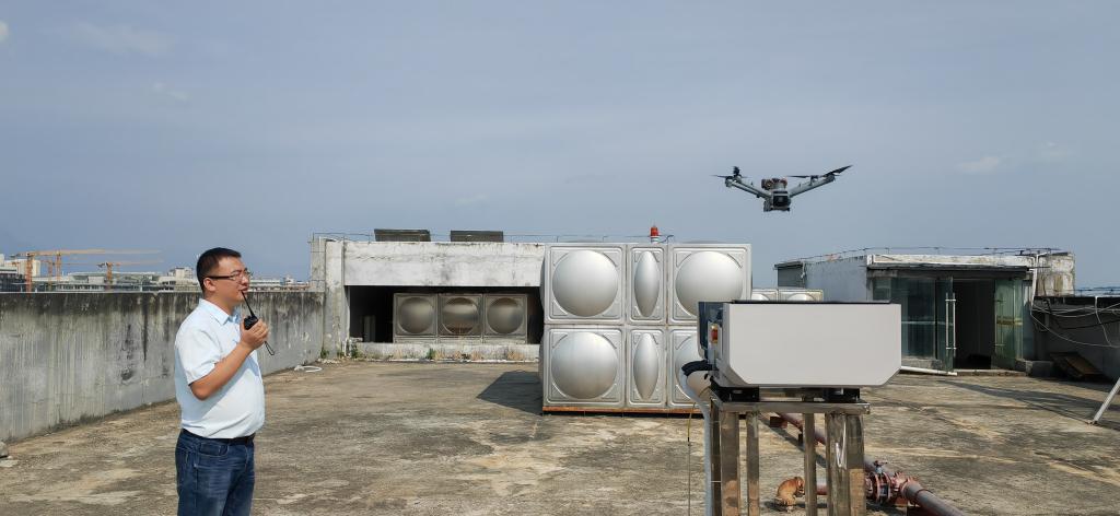 在蒙自市城区的一处楼顶,工作人员正在指挥远程操控无人机。新华社记者浦超 摄
