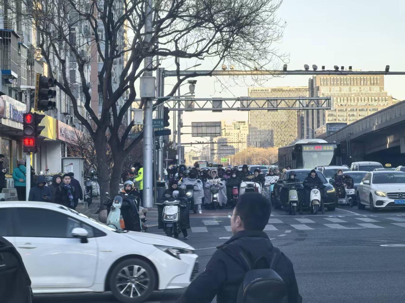 记者在北京多个路口观察发现,电动自行车骑乘人员头盔佩戴率不足三成。寒冬时节,各式棉帽、口罩与羽绒服的连身帽成了骑行者的“标配”。还有人因毛线帽子较厚,将头盔悬空架在头顶,徒具形式。对比之下,头盔佩戴情况较好的反而是外卖、快递行业的从业者,这背后离不开平台的硬性要求。