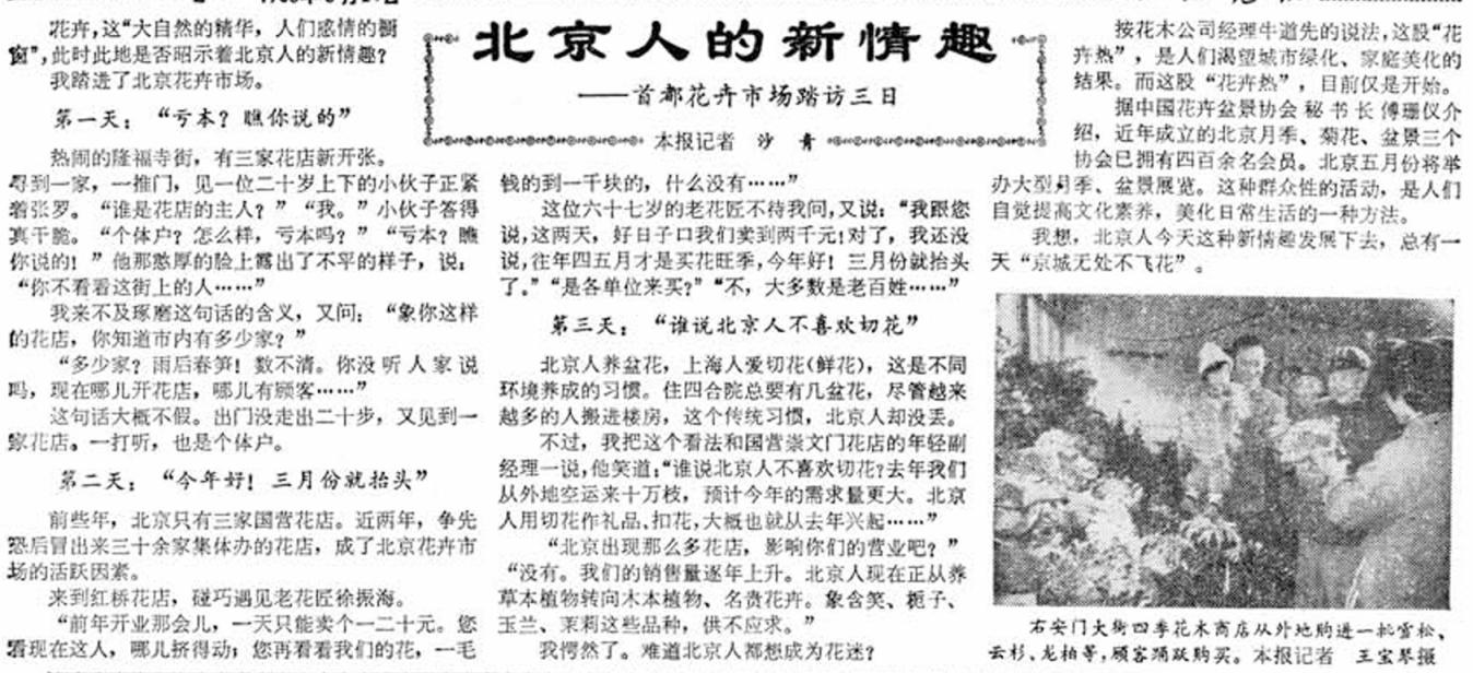 此后短短一两年时间,国营、集体还有个体的30余家花店争先恐后地冒出来,活跃了北京花卉市场。1983年,红桥花店里满目苍翠,顾客摩肩接踵,好不热闹。店主徐振海是一名老花匠,他说,前来买花的多是北京市民,两年前刚开业时,一天只能卖一二十元;现在一到周末,花店里总是人挤人,好的时候一天能卖到一两千元。(1983年3月24日《北京晚报》2版,《北京人的新情趣》)